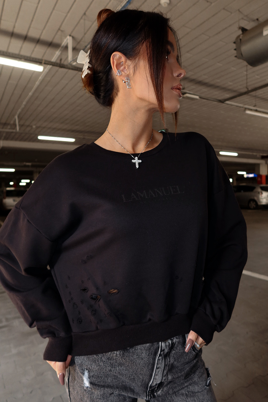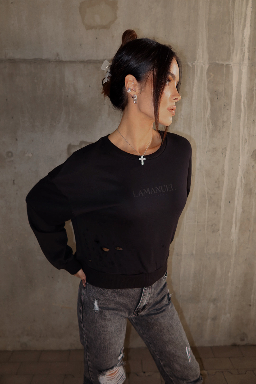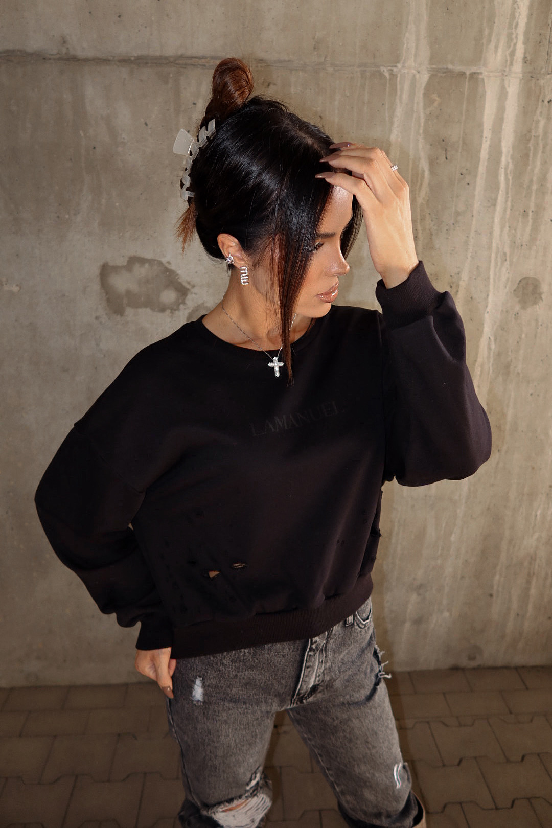 Bluza o swobodnym fasonie, ozdobiona ręcznie wykonanymi przetarciami, które nadają jej surowy, miejski charakter. Minimalistyczne logo i klasyczna forma równoważą styl vintage z nowoczesnym luzem. Idealna do jeansów, spodni cargo lub shortów.Skład: 90% bawełna 10% poliester