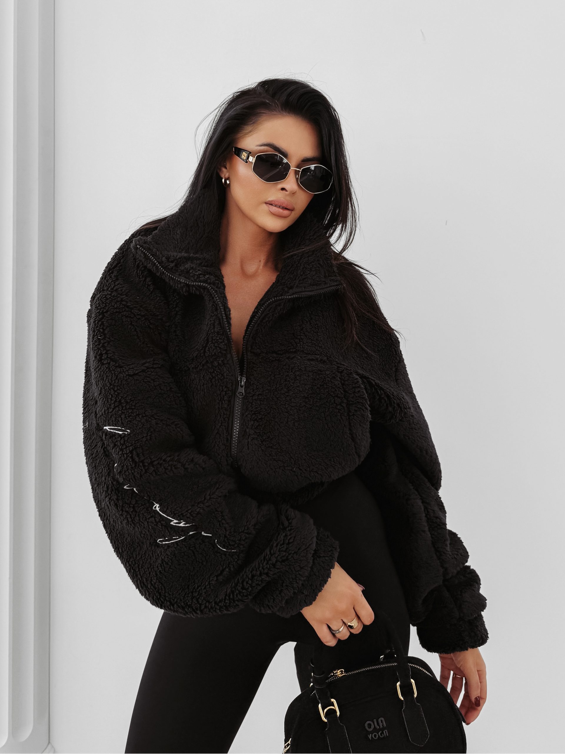 Delikatnie oversiz’owa, rozpinana bluza z wysoka stójka. Wykonana z miękkiego materiału, typu teddy, domieszką wiskozy. Zdobiona subtelnym haftem z logo marki OLAVOGA na rękawie. Posiada wysoki kołnierz i praktyczne kieszenie z przodu produktu.
