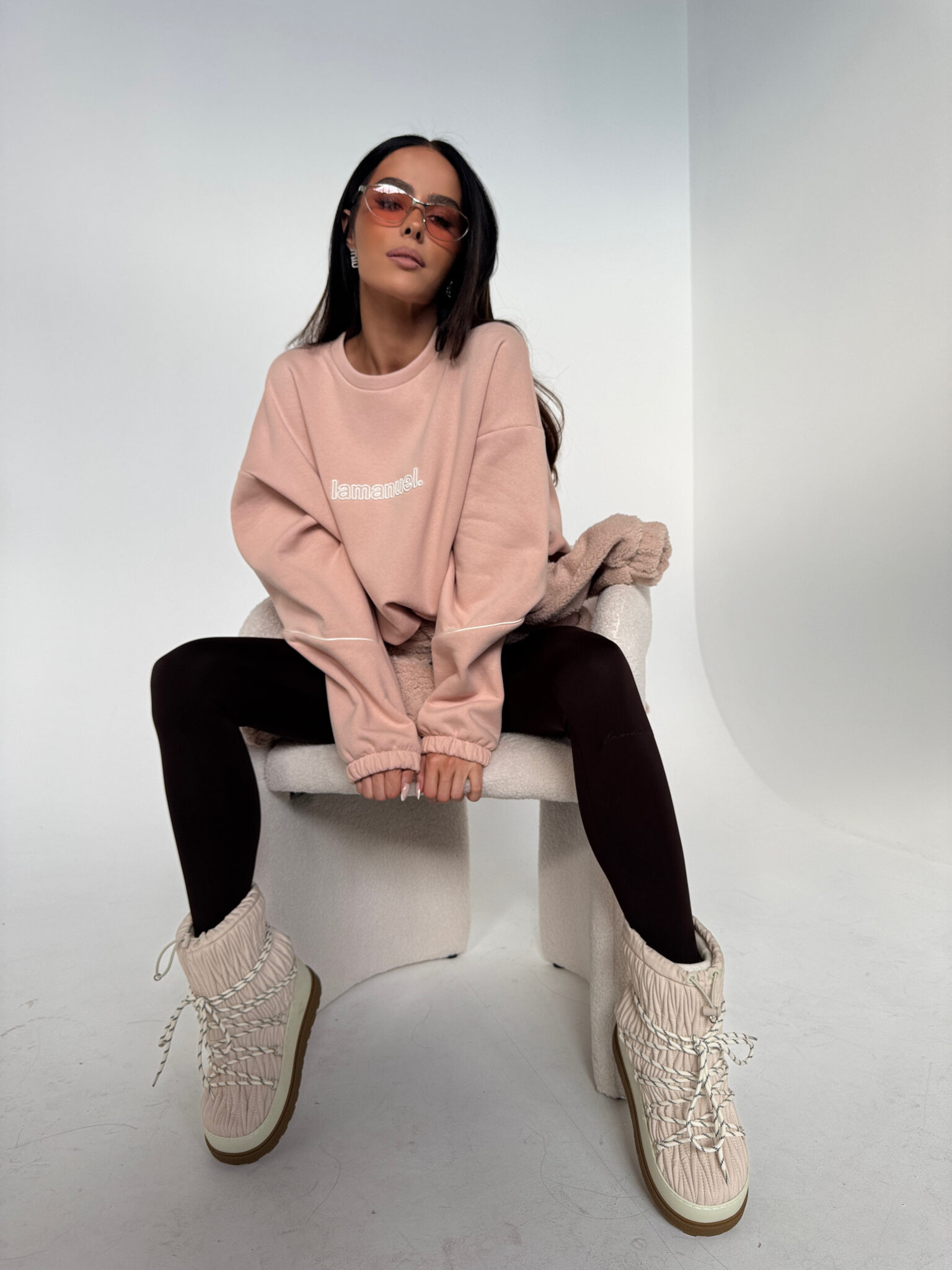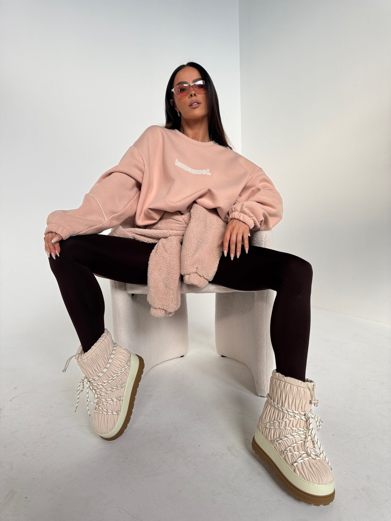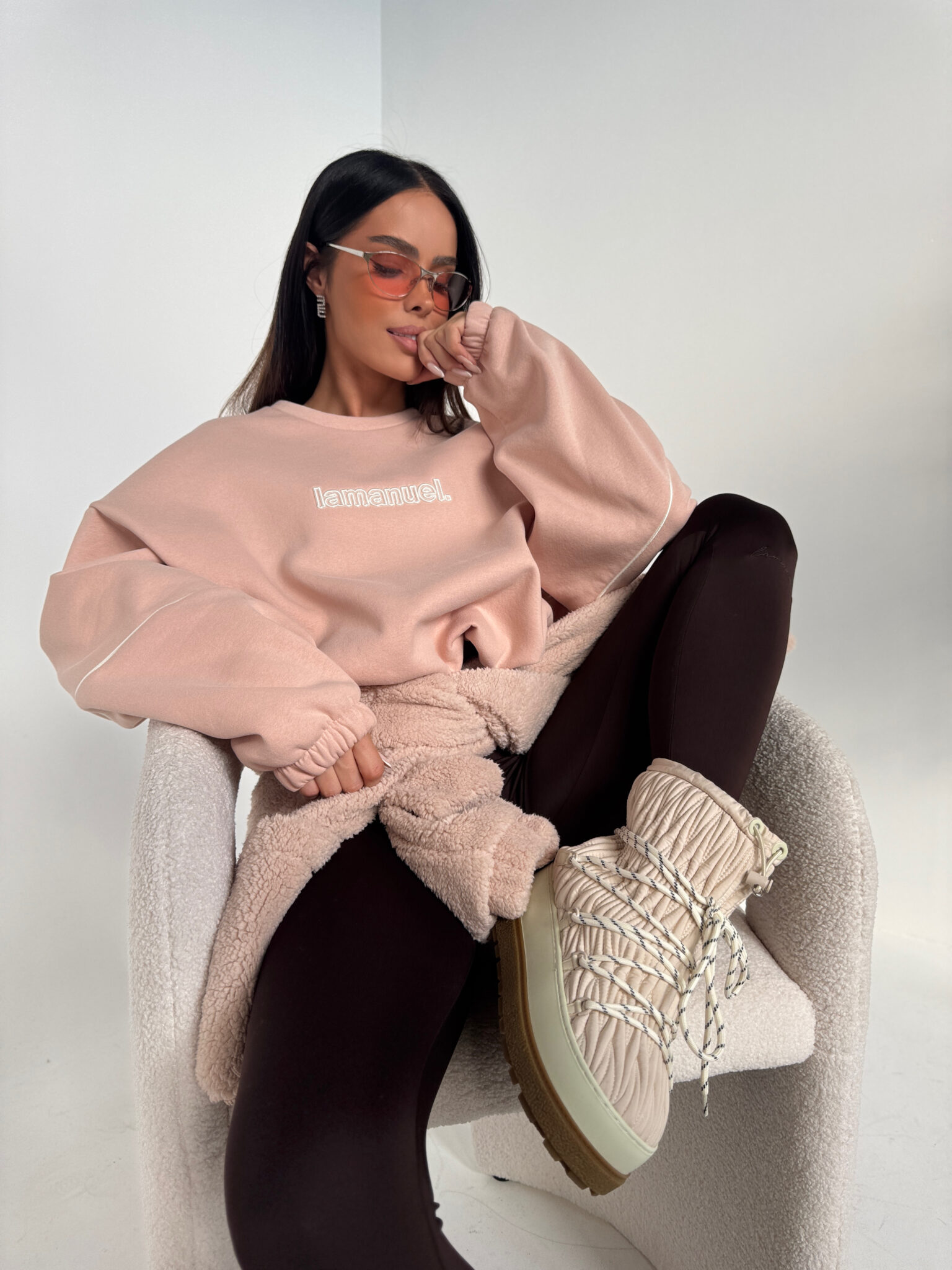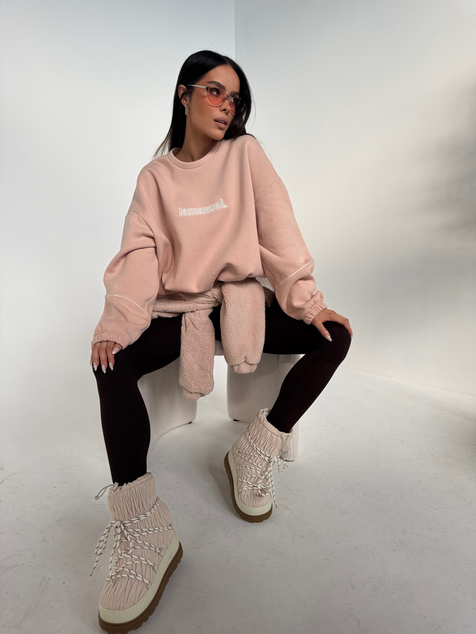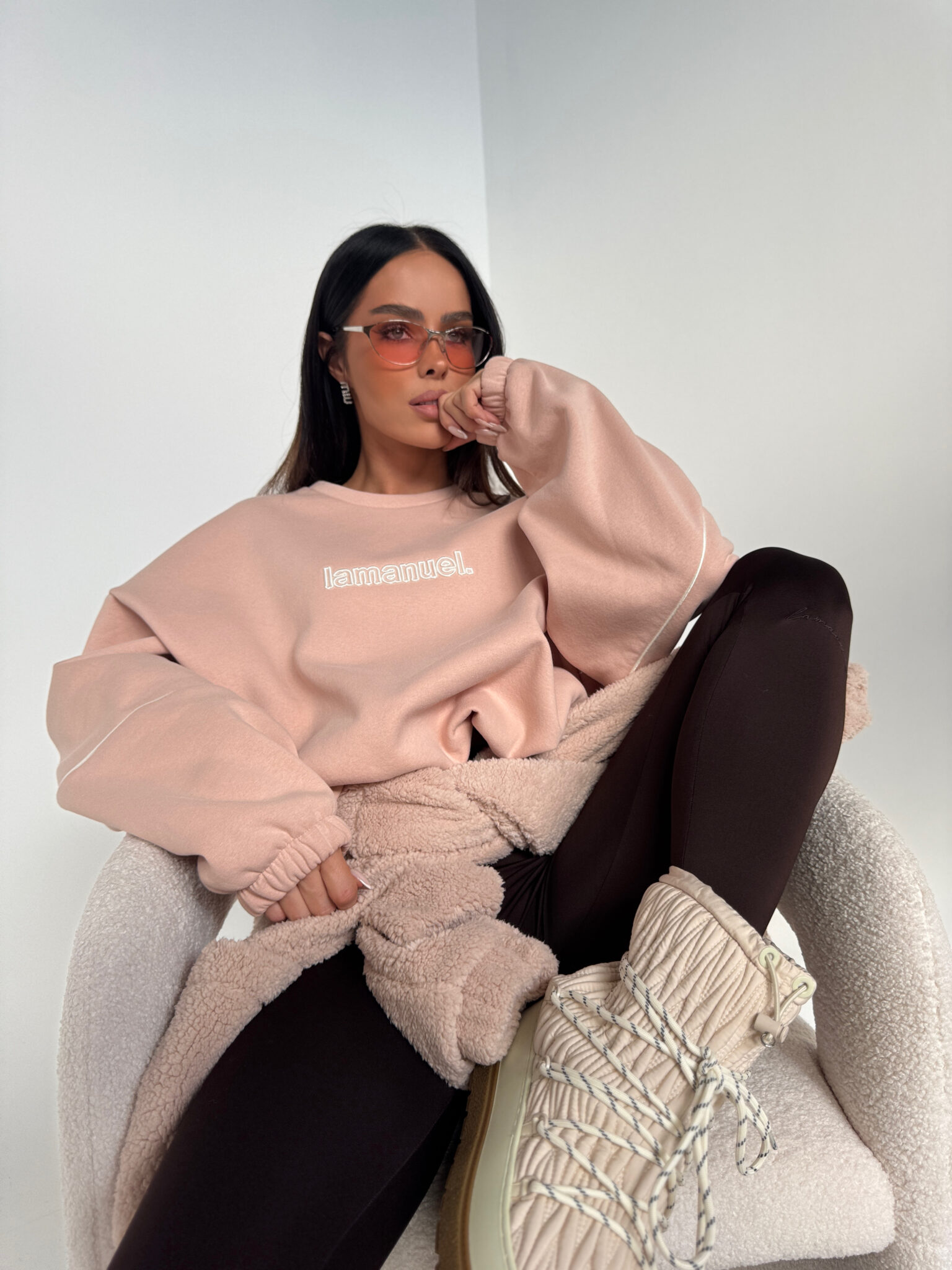Bluza z dzianiny drapanej o przytulnym, miękkim wykończeniu typu „miś”. Luźny, oversize’owy krój z obniżoną linią ramion i wypustką na rękawach. Z przodu haftowane logo, ściągana na gumkę. Idealna do codziennych i domowych stylizacji – komfortowa, a jednocześnie stylowa.Skład: 90% bawełna 10% poliester