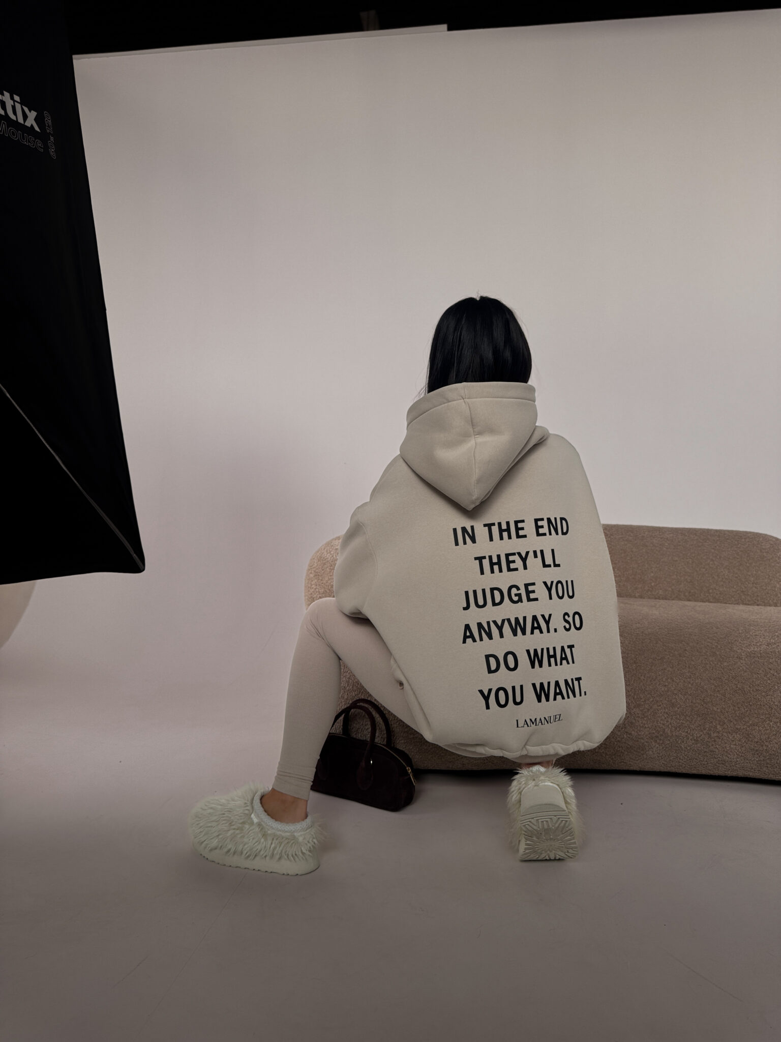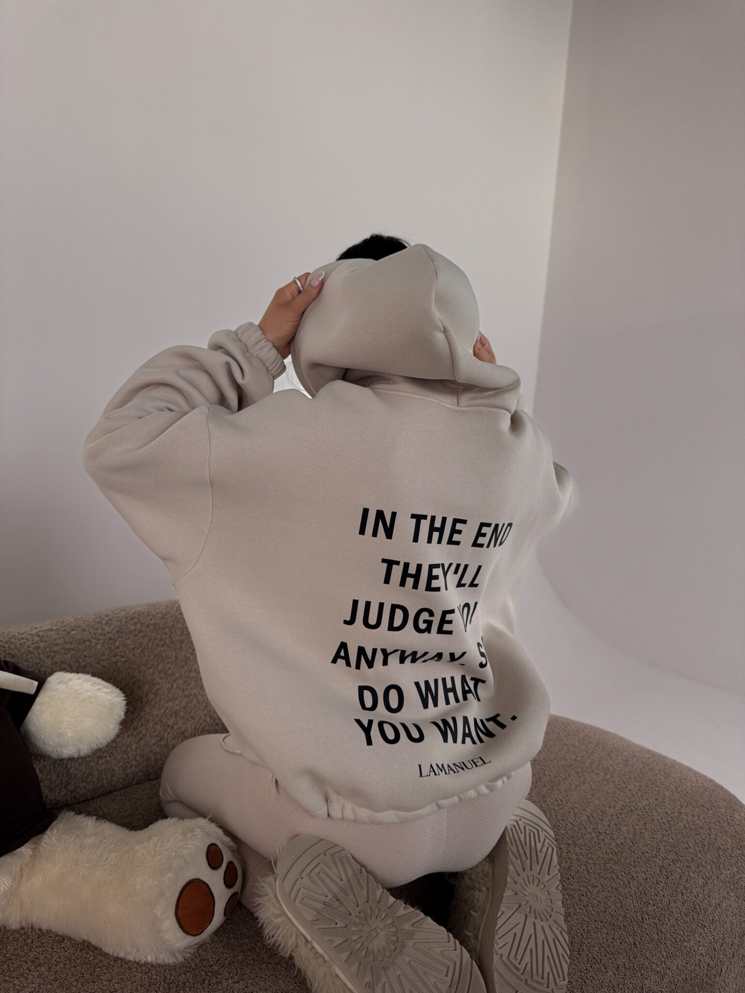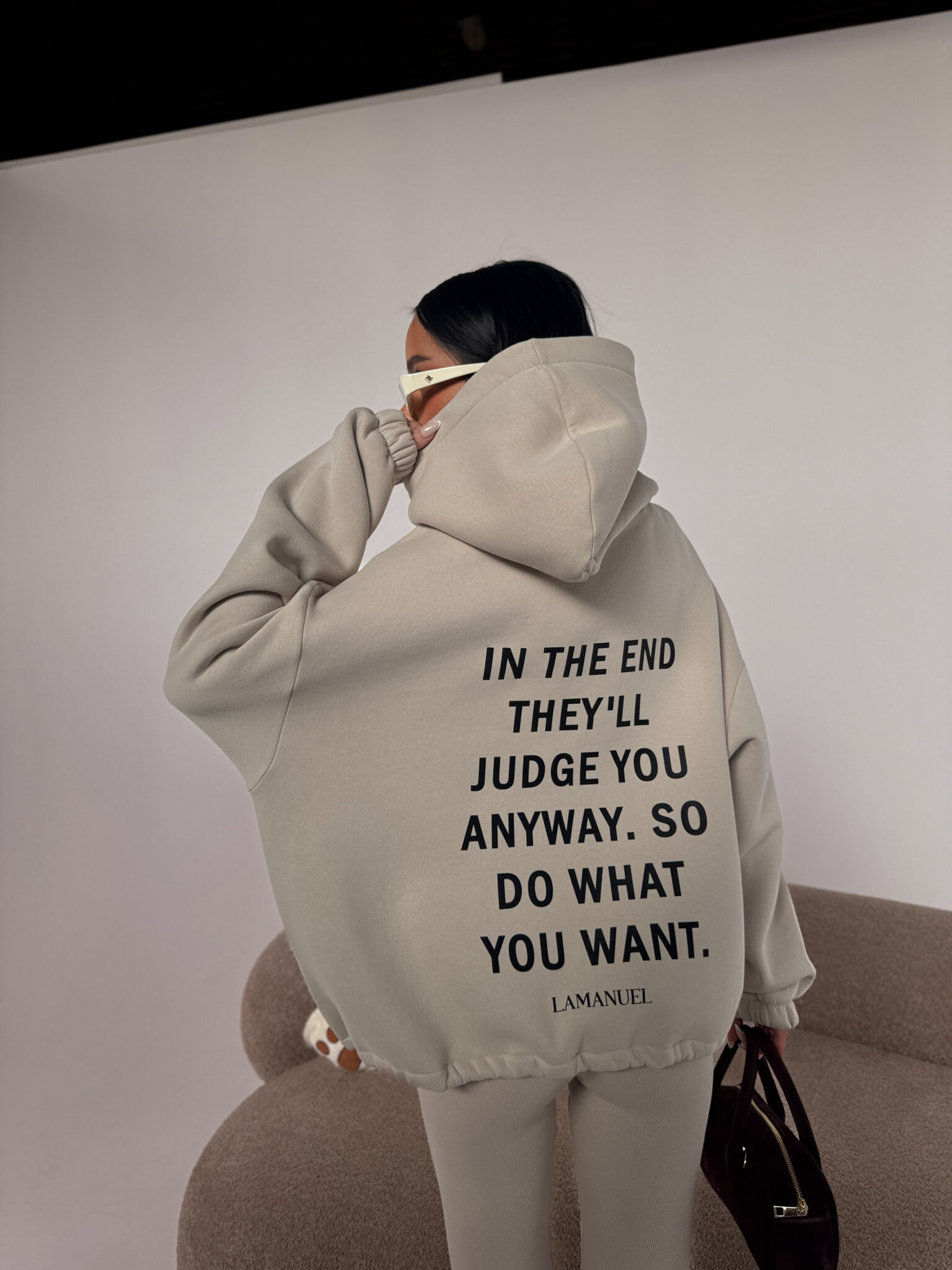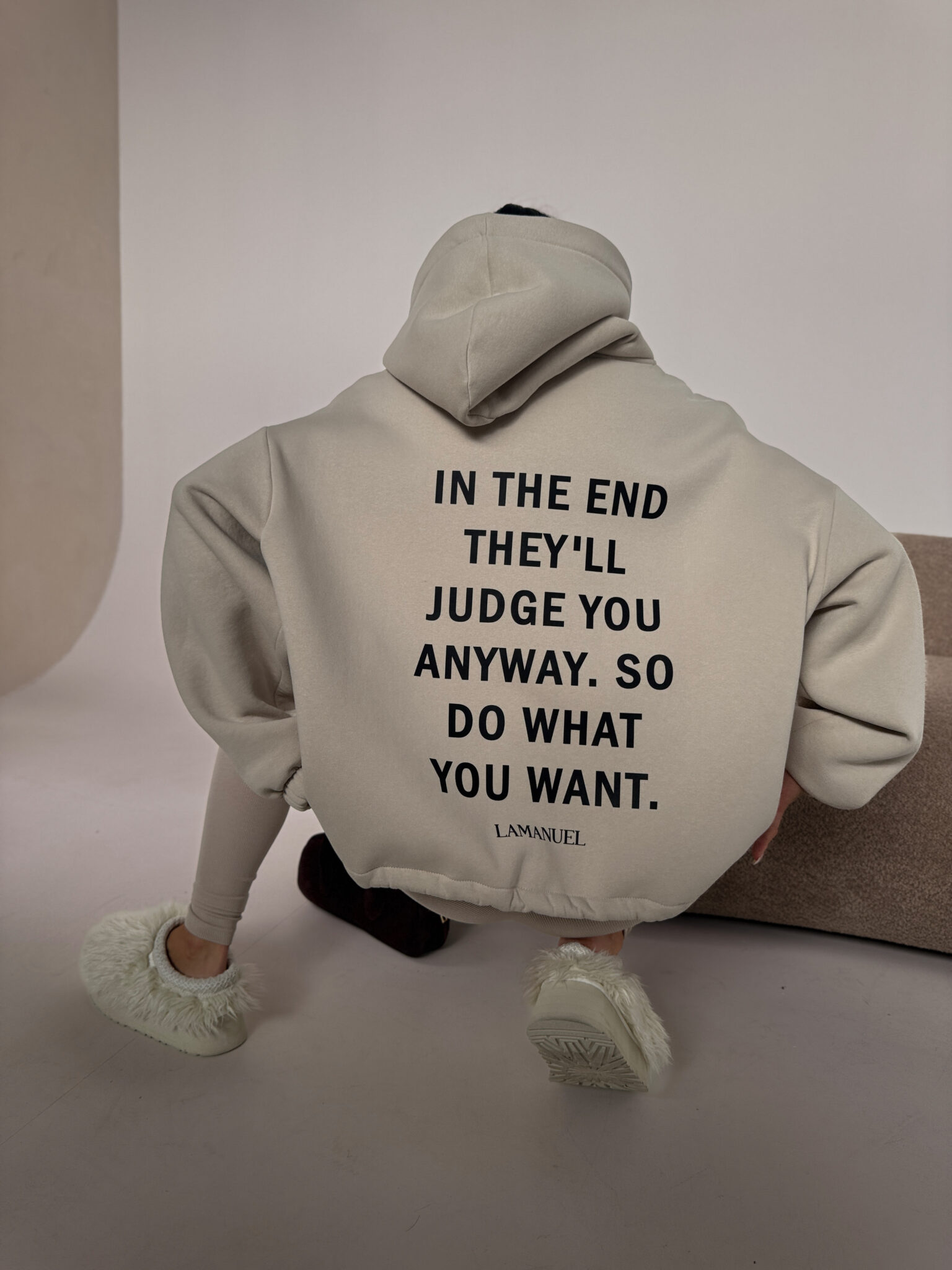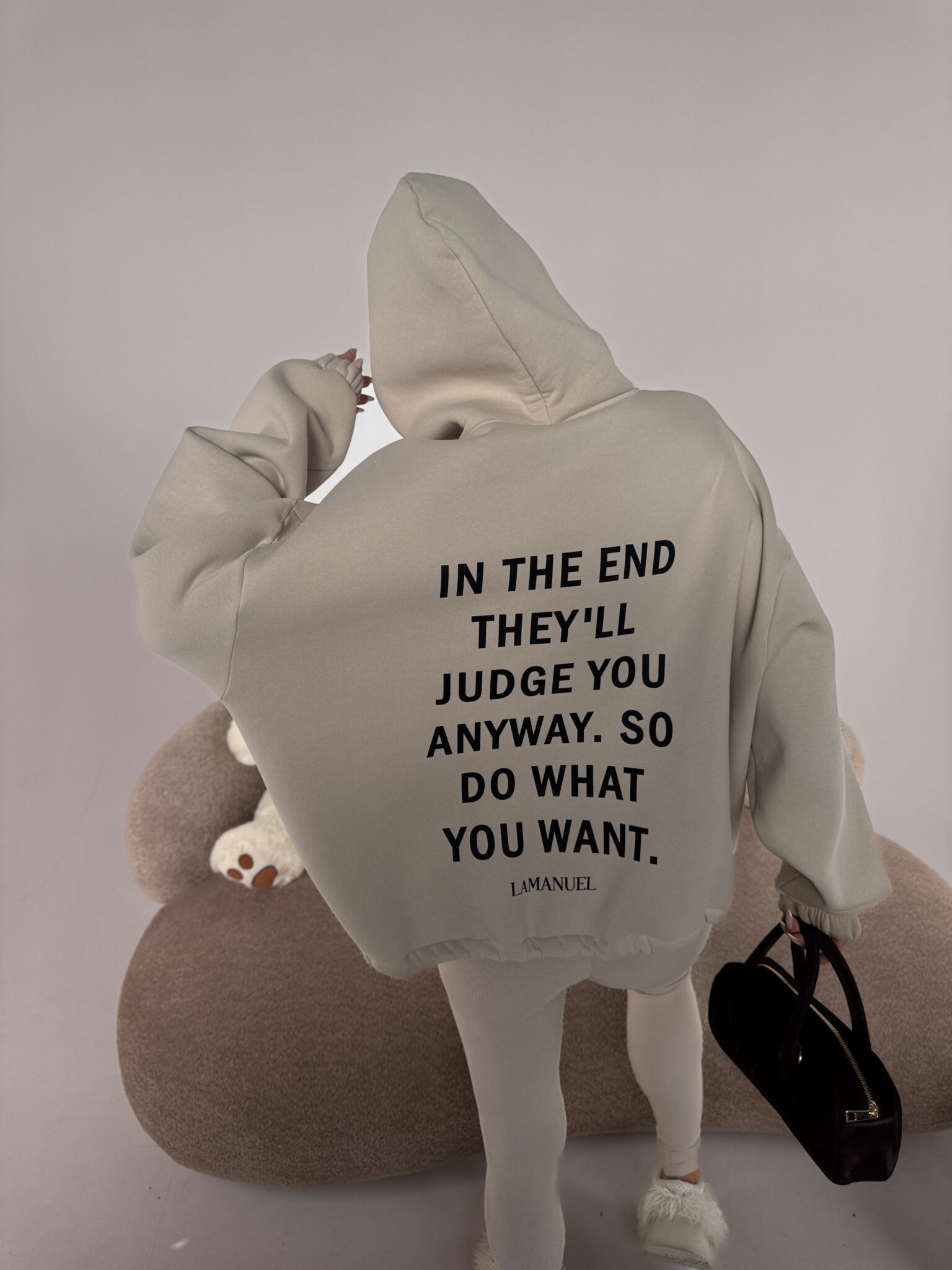 Bluza z grubszej, drapanej dzianiny daje totalny komfort i porządne wykończenie, a klasyczna długość z regulacją na dole pozwala nosić ją tak, jak lubisz — luźno, prosto albo lekko podciągniętą, z przodu logo, z tyłu konkretny tekst, który mówi wszystko za Ciebie.Skład: 90% bawełna 10% poliester