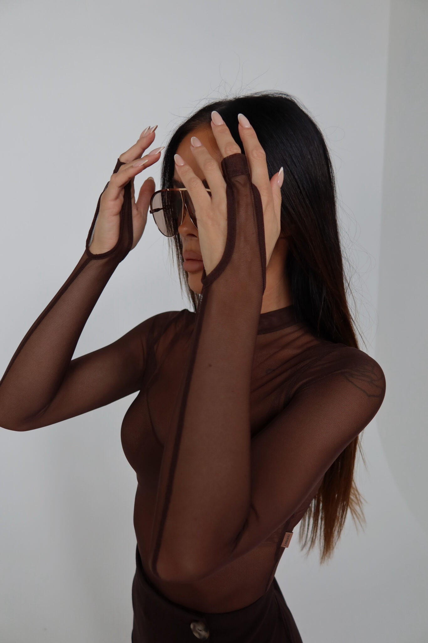 Dopasowane body z elastycznej, transparentnej siateczki, zaprojektowane z myślą o odważnych, nowoczesnych sylwetkach. Długi rękaw wykończony otworem na środkowy palec tworzy efekt przedłużonej linii dłoni i dodaje stylizacji edgy klimatu. Półgolf przy szyi i delikatne przeszycia podkreślają minimalistyczny, ale wyrazisty krój. Idealne do noszenia solo lub warstwowo – z gorsetem, pod kamizelkę lub marynarkę.Skład: 95% poliester 5% elastan