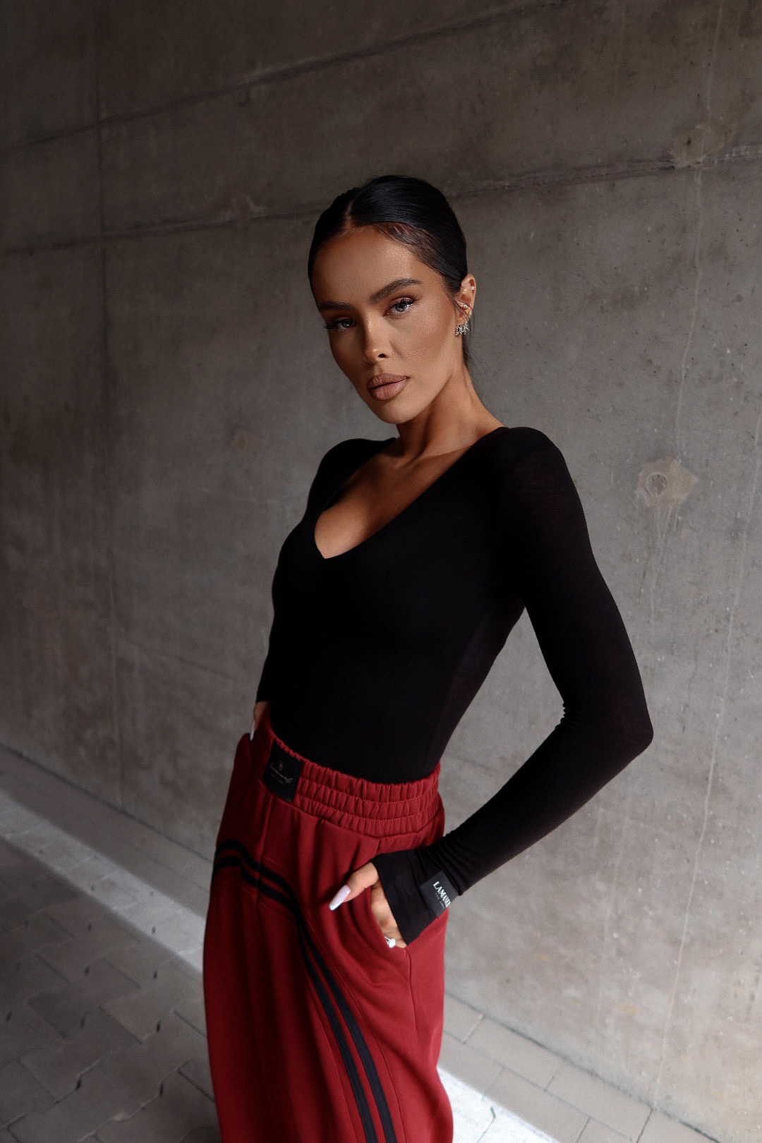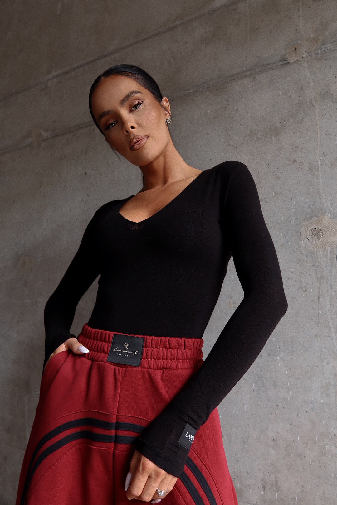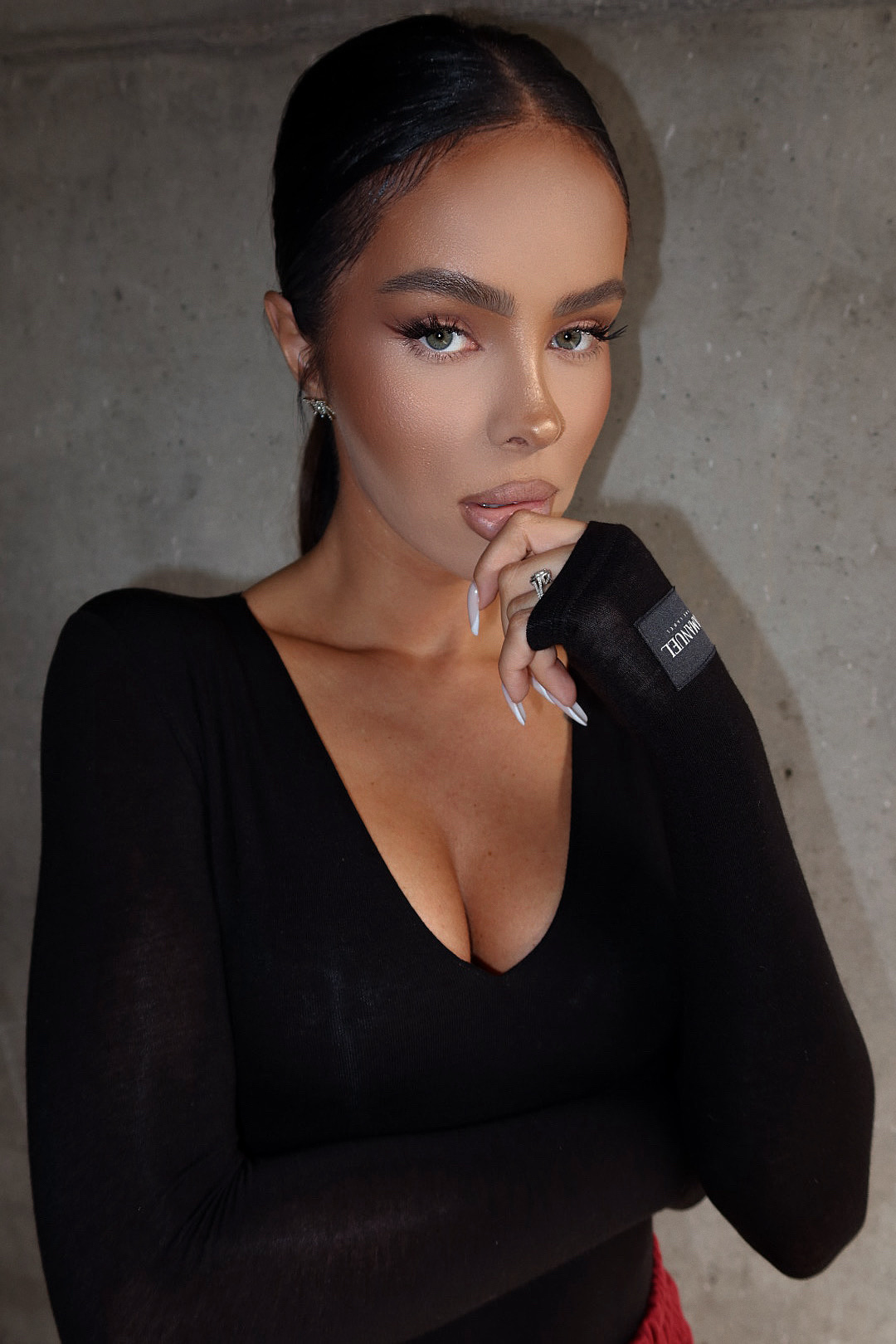 Body wykonane z wyjątkowo miękkiej, sweterkowej dzianiny, która zapewnia komfort noszenia i przyjemne otulenie. Przód podszyty dodatkową warstwą materiału dla większego komfortu i lepszego krycia. Dopasowany fason pięknie układa się na sylwetce, a elastyczny materiał dopasowuje się do ciała bez uczucia ucisku. Model z głębokim dekoltem w kształcie litery V oraz przedłużonym rękawem z naszywką z logo na mankiecie. Zapinane na haftki w kroku, z wykończeniem typu string – idealne pod dopasowane spodnie czy spódnice. Uniwersalna baza do codziennych i wieczorowych stylizacji.Skład: 73% tencel 19% wełna 8% spandex