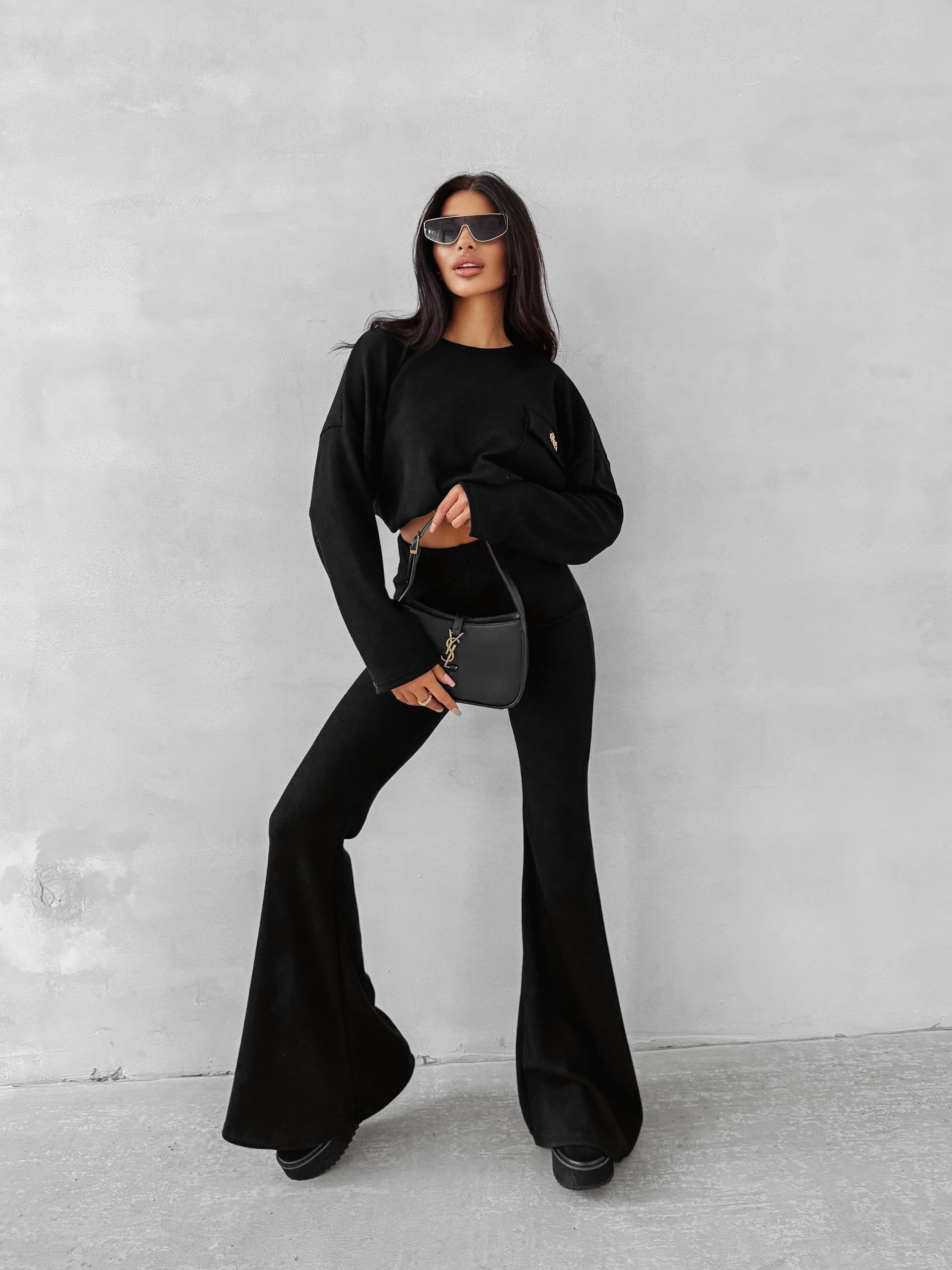 Dół to idealnie dopasowane spodnie z wysokim stanem, które pięknie modelują talię i podkreślają kobiecą sylwetkę. Absolutnym hitem jest ich krój z nogawką rozszerzaną ku dołowi (typu flare). To modne rozwiązanie nie tylko optycznie wydłuża nogi, ale także doskonale równoważy luźniejszą górę, tworząc spójną i niezwykle stylową całość.