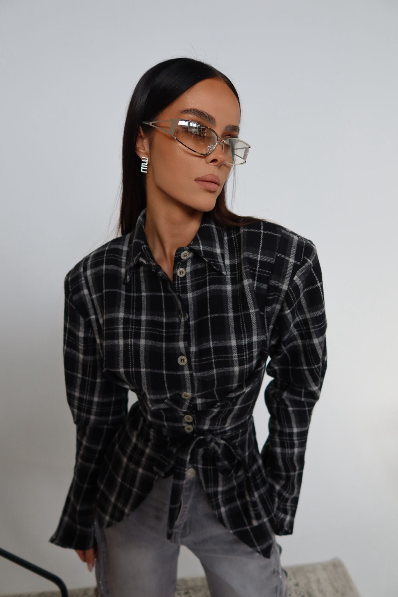 Koszula z wyraźnie zaznaczoną talią o kroju przypominającym gorset. Konstrukcja z poduszkami w ramionach podkreśla sylwetkę, a dopasowany dół pięknie ją modeluje. Z przodu klasyczne zapięcie na guziki, z tyłu wiązanie umożliwiające regulację dopasowania. Uszyta z miękkiej tkaniny w kratę – połączenie klasyki z nowoczesną formą.Skład: 50% bawełna 50% poliester