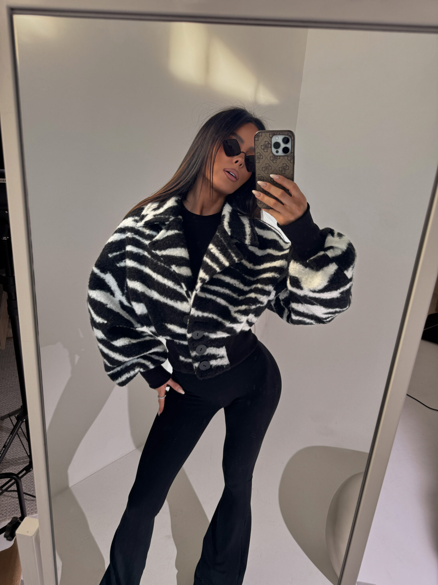 PRODUKT LIMITOWANY!Miękka w dotyku kurtka z przyjemną podszewką i mocnym printem zebra robi efekt już od wejścia, ma krótszy, pudełkowy krój, szerokie rękawy i grube guziki z przodu, a całość balansuje między wygodą a wyrazistym lookiem, który nie potrzebuje dodatków, żeby przyciągać uwagę.Skład: 100% poliester