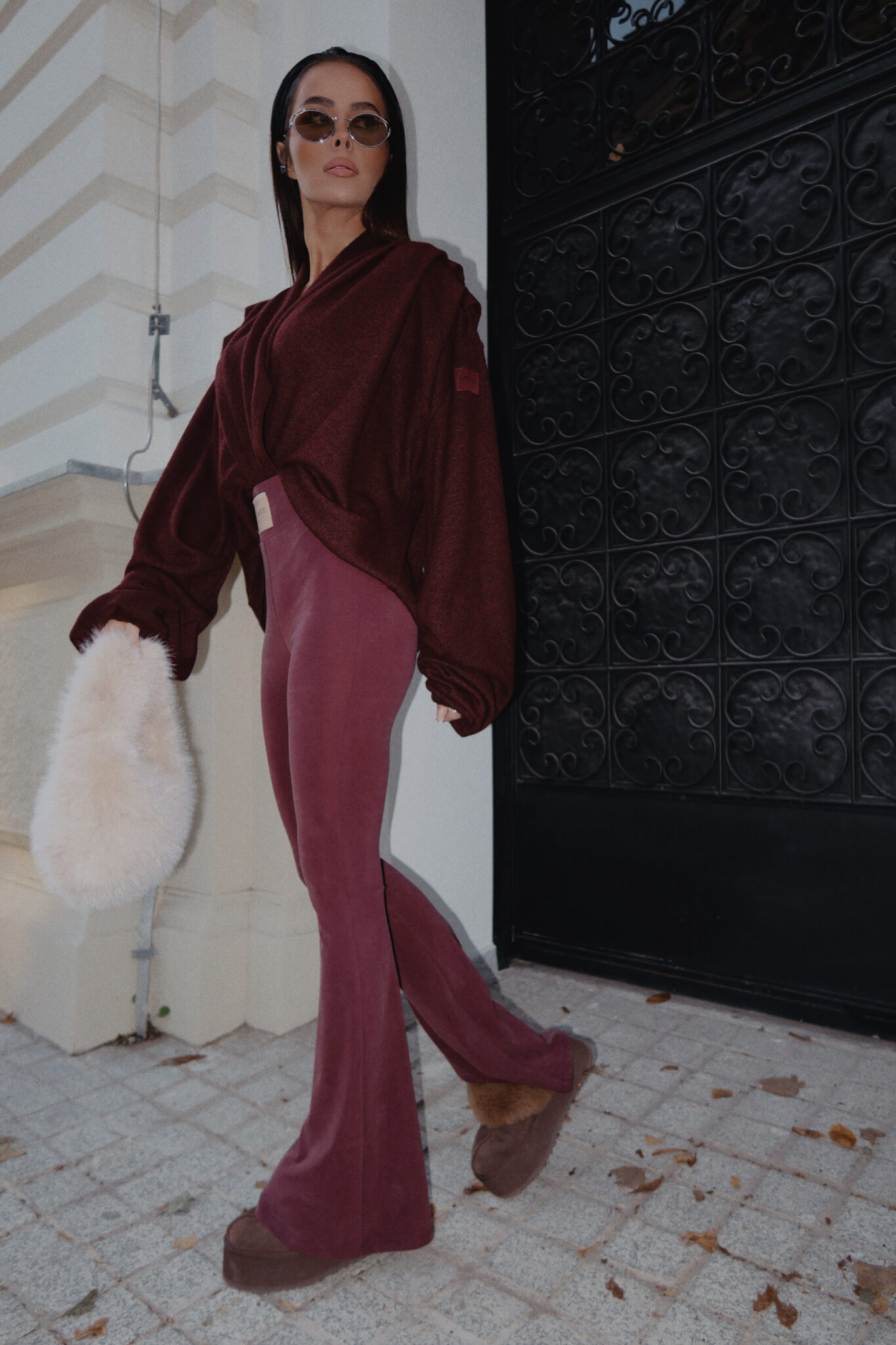 Spodnie o dopasowanym kroju z rozszerzaną nogawką, wykonane z miękkiej i elastycznej dzianiny. Wysoki stan podkreśla talię i zapewnia komfort noszenia, a rozszerzenie nogawek ku dołowi optycznie wydłuża sylwetkę. Szeroka guma w pasie z logo lamanuel dodaje wyrazistego charakteru i sprawia, że spodnie idealnie dopasowują się do ciała. Model doskonale sprawdzi się zarówno w codziennych stylizacjach, jak i w bardziej sportowym wydaniu.Skład: 53% lyocell 38% poliester 9% spandex