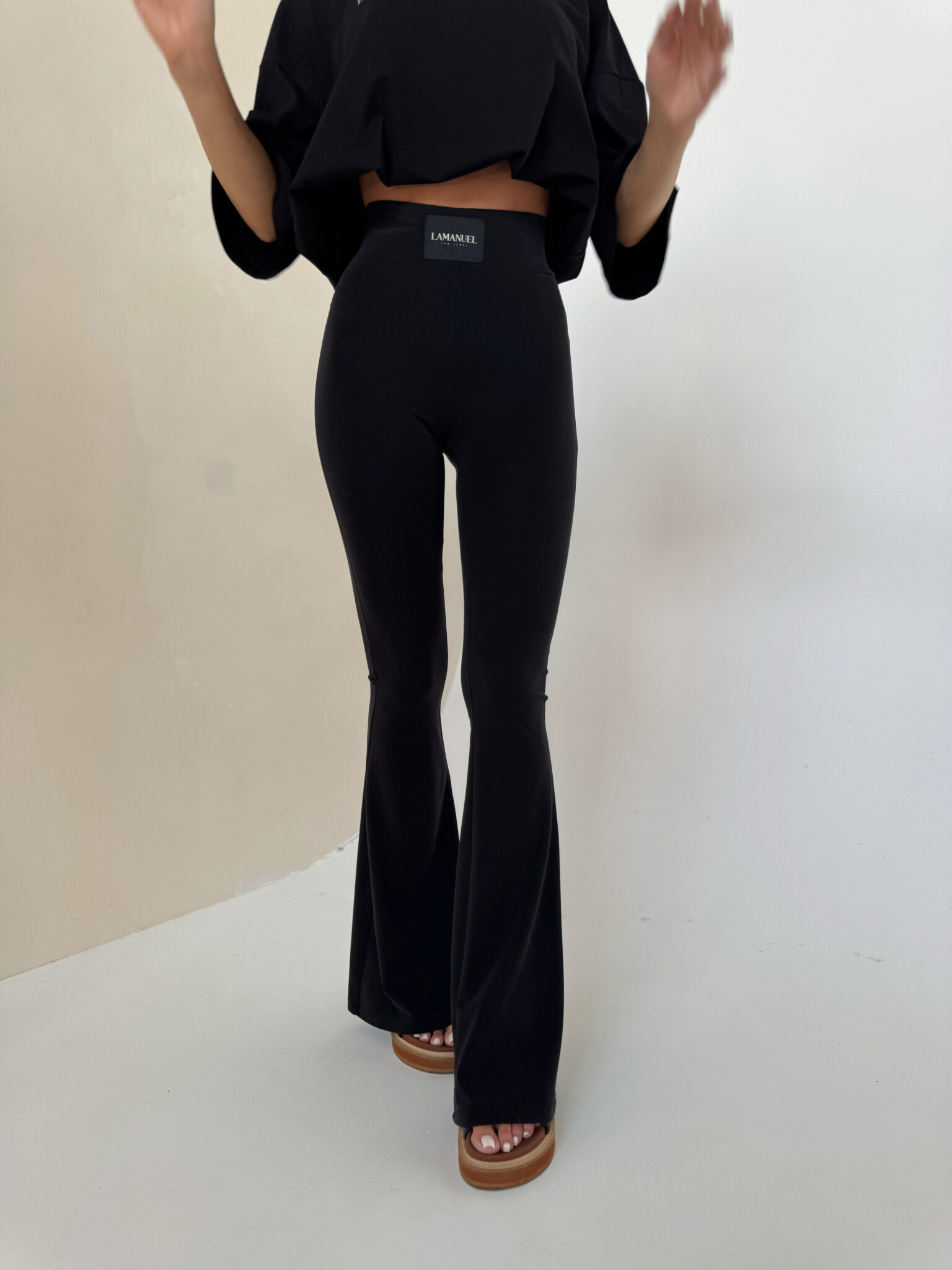 Spodnie o dopasowanym kroju z rozszerzaną nogawką, wykonane z miękkiej i elastycznej dzianiny. Wysoki stan podkreśla talię i zapewnia komfort noszenia, a rozszerzenie nogawek ku dołowi optycznie wydłuża sylwetkę. Szeroka guma w pasie z logo lamanuel dodaje wyrazistego charakteru i sprawia, że spodnie idealnie dopasowują się do ciała. Model doskonale sprawdzi się zarówno w codziennych stylizacjach, jak i w bardziej sportowym wydaniu.Skład: 53% lyocell 38% poliester 9% spandex