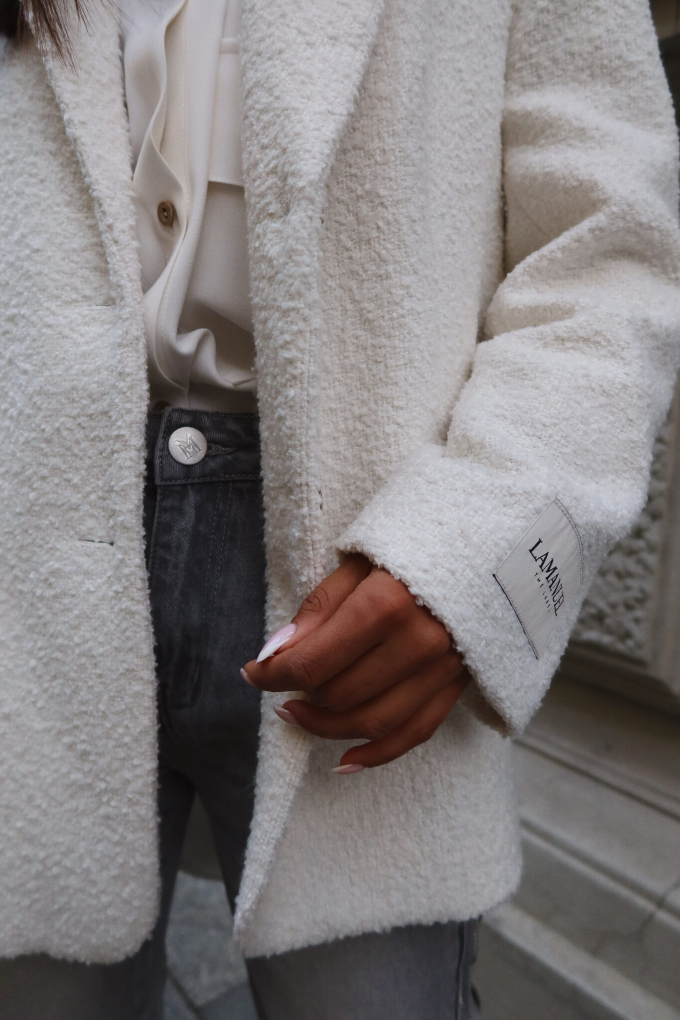 Marynarka o fakturze boucle z wyrazistą strukturą i dopracowanym krojem, który pozwala nosić ją jak lekki płaszcz. Miękka, ale trzymająca formę, z szerokimi klapami i ozdobnymi guzikami, sprawdzi się zarówno w eleganckich, jak i codziennych zestawieniach. Idealna do warstwowych stylizacji – narzucona na koszulę, sweter czy nawet cienką kurtkę. Stylowa alternatywa dla klasycznego okrycia wierzchniego.Skład: 100% poliester