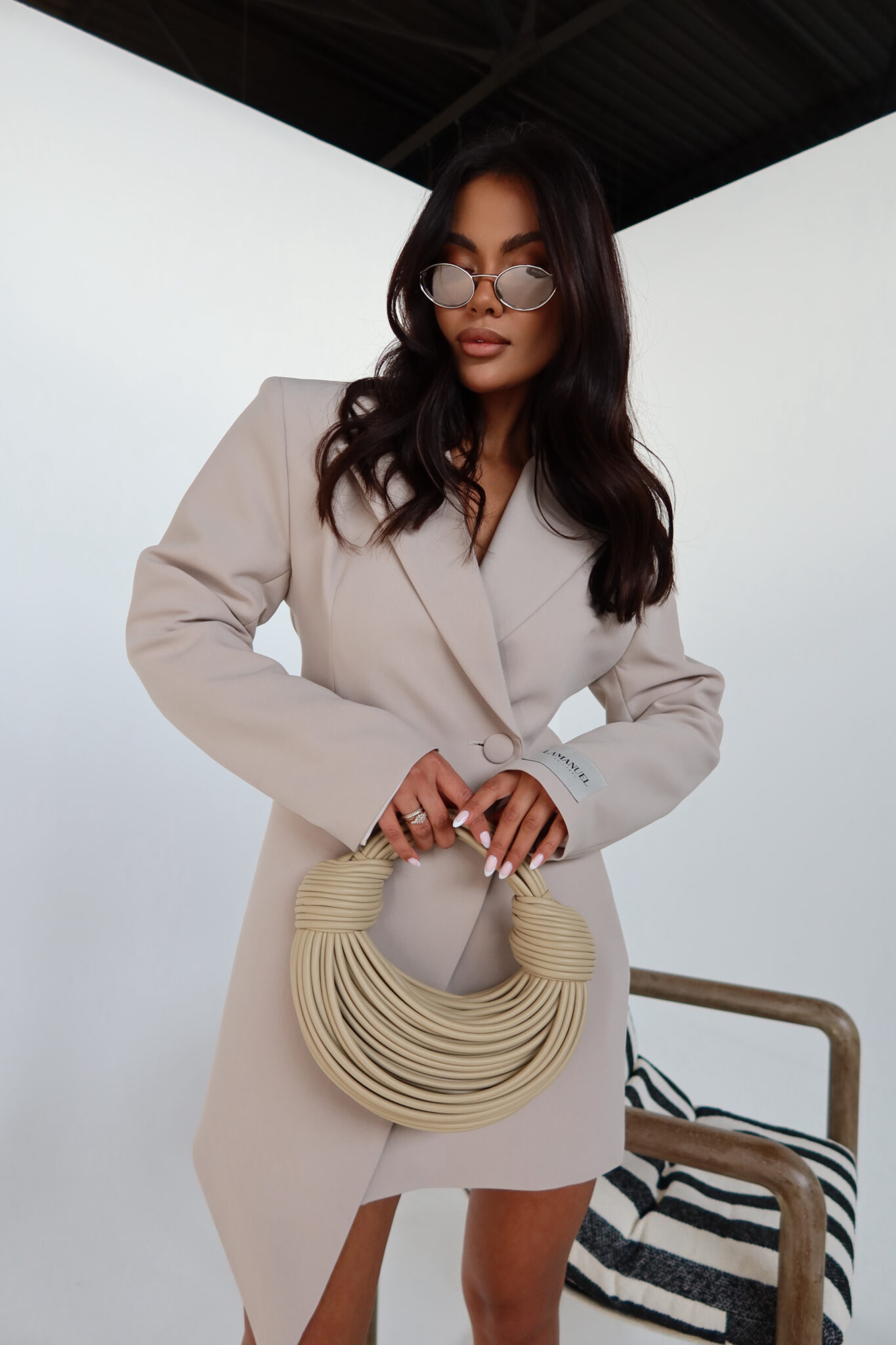 Elegancka sukienka o kroju marynarki z charakterystycznym, asymetrycznym dołem. Model zapinany na guzik, z klasycznym kołnierzem i wszytą podszewką. Idealna na wieczór, biznesowe spotkanie lub stylowy dzień w mieście. Świetnie układa się na sylwetce i podkreśla talię.Skład: 80% poliester 15% rayon 5% spandex