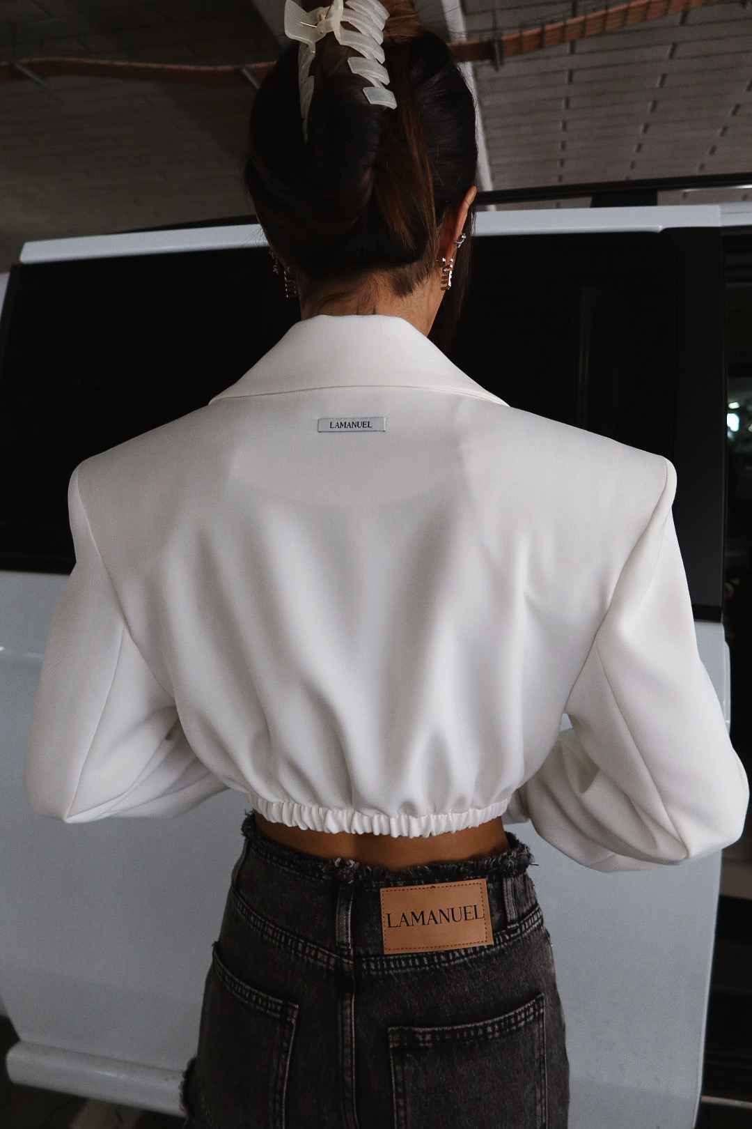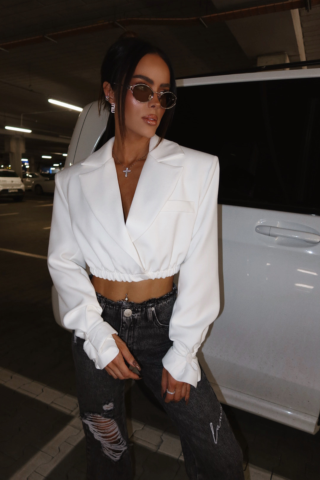 Ta marynarka robi całą stylówkę. Oversize’owy krój w wersji cropped i taliowanie gumką dają idealny balans między elegancją a streetem. Ale to rękawy są tu gwiazdą – szerokie, zapięciem na guziki. Możesz spiąć je od góry, od dołu albo zostawić luźno – za każdym razem dają zupełnie inny efekt.Skład: 73% poliester 21% wiskoza 6% spandex