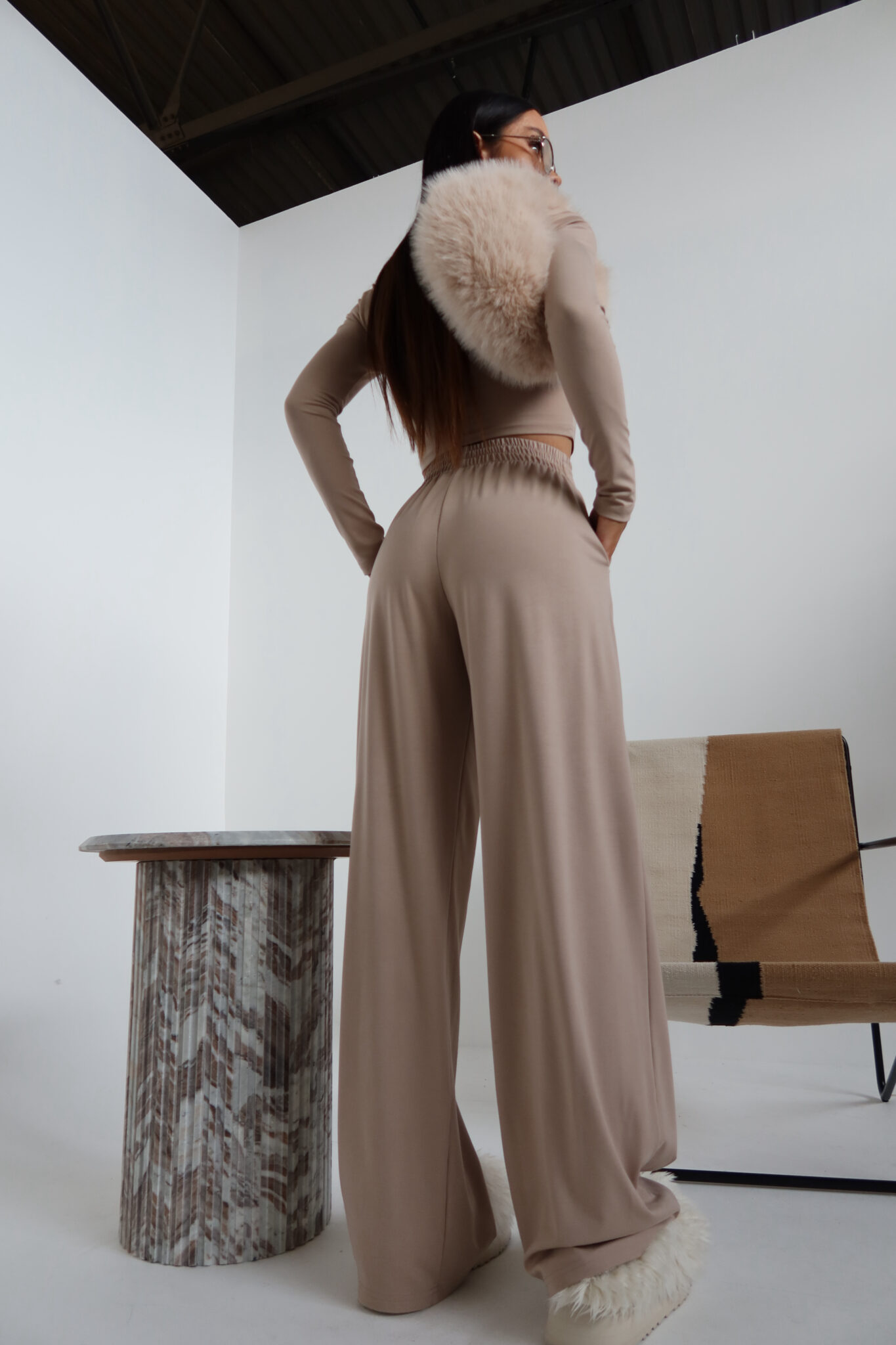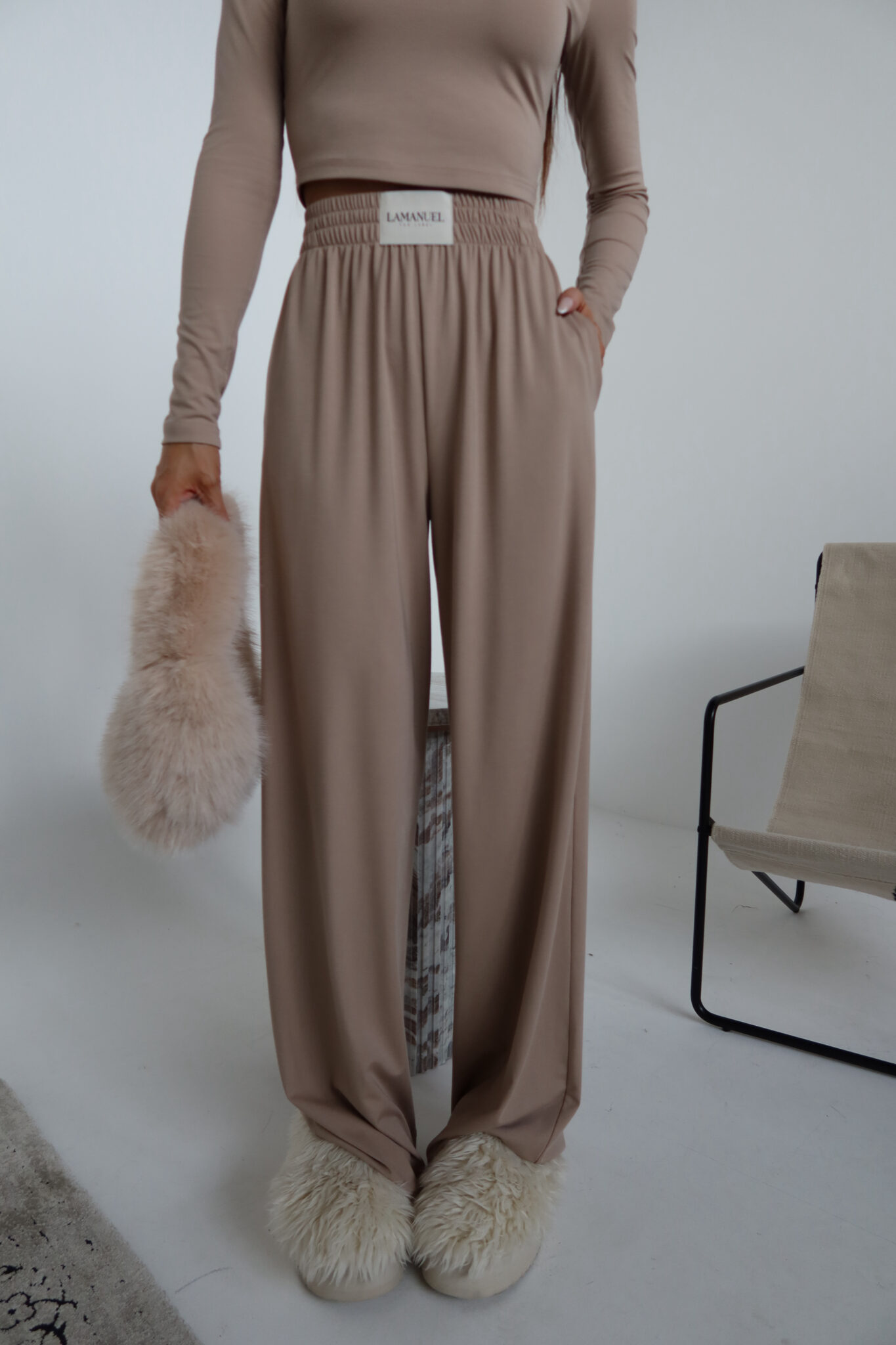 Luźne spodnie z modalu z wysokim, elastycznym stanem wykończonym szeroką gumą i metką z logo. Miękka, lejąca tkanina pięknie układa się na sylwetce i zapewnia pełną swobodę ruchów. Model z kieszeniami. Idealne zarówno do stylizacji domowych, jak i codziennych.Skład: 60% rayon 31% nylon 9% spandex