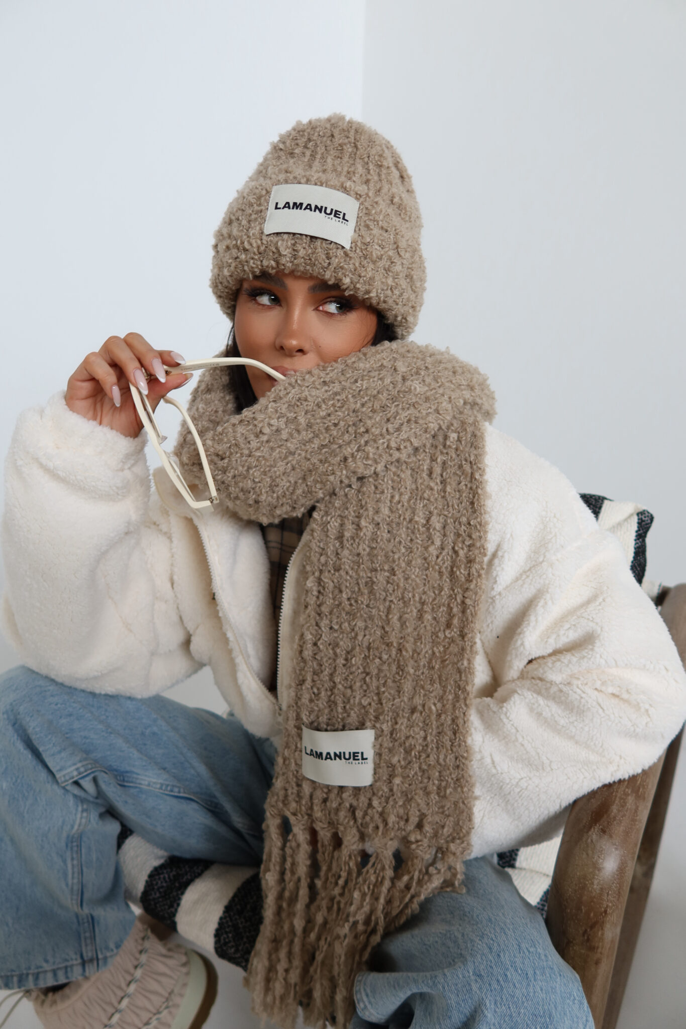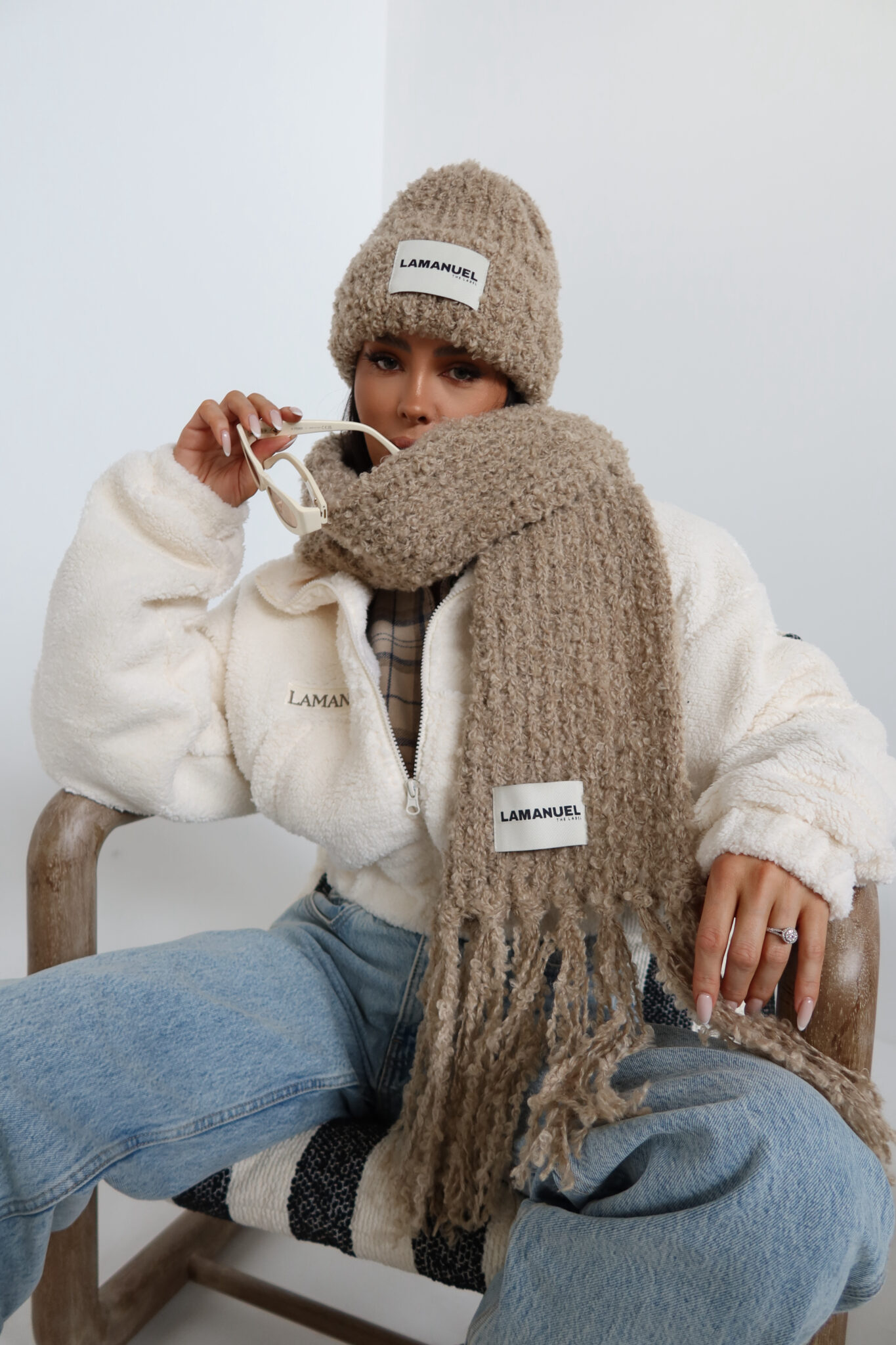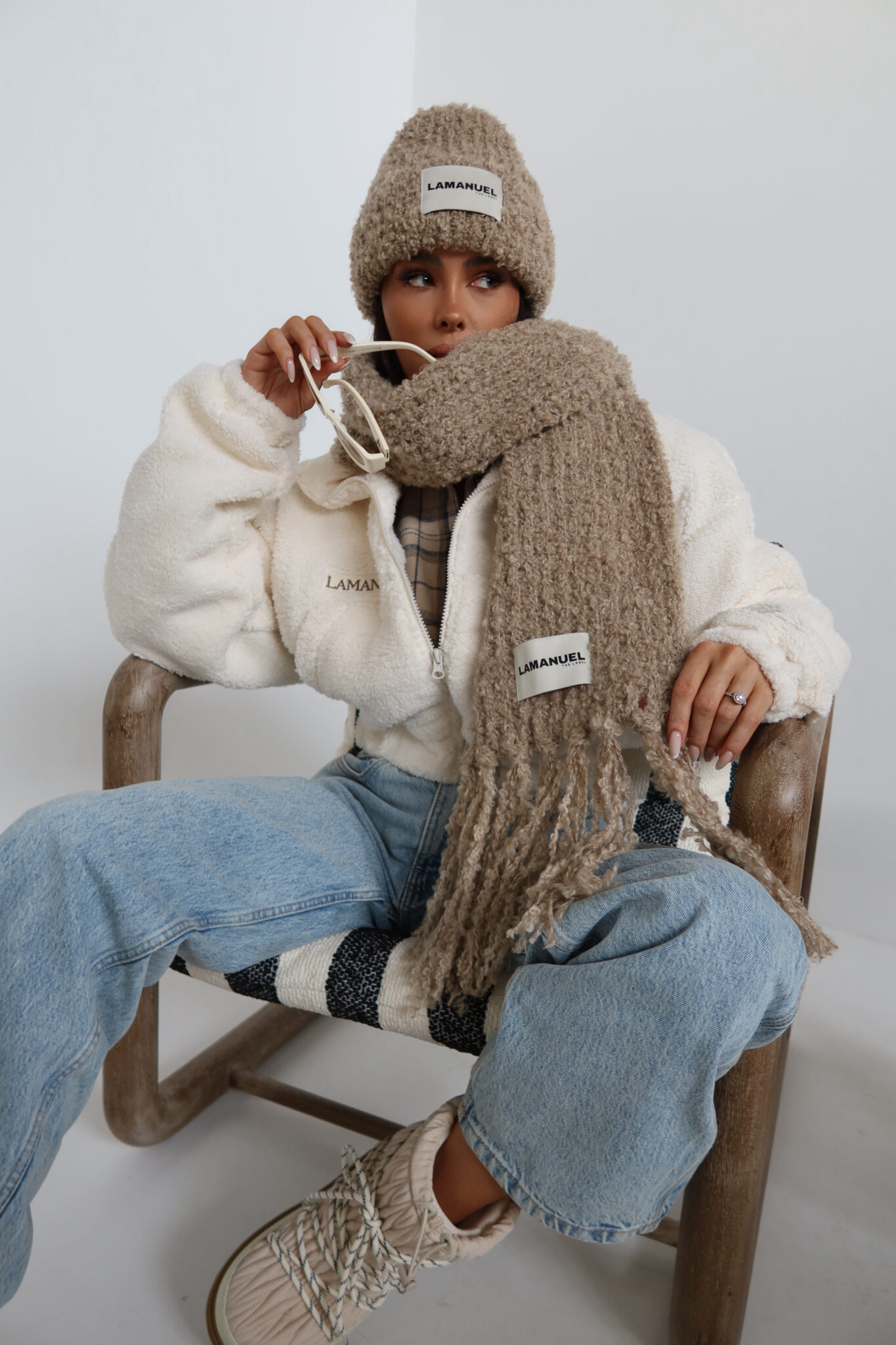 Mięsisty szalik z grubym splotem i długimi frędzlami. Wyróżnia się charakterystyczną fakturą i widoczną naszywką z logo. Otula szyję i dodaje stylu każdej zimowej stylizacji.Skład: 38% akryl 25% moher 20% wełna 17% poliamid