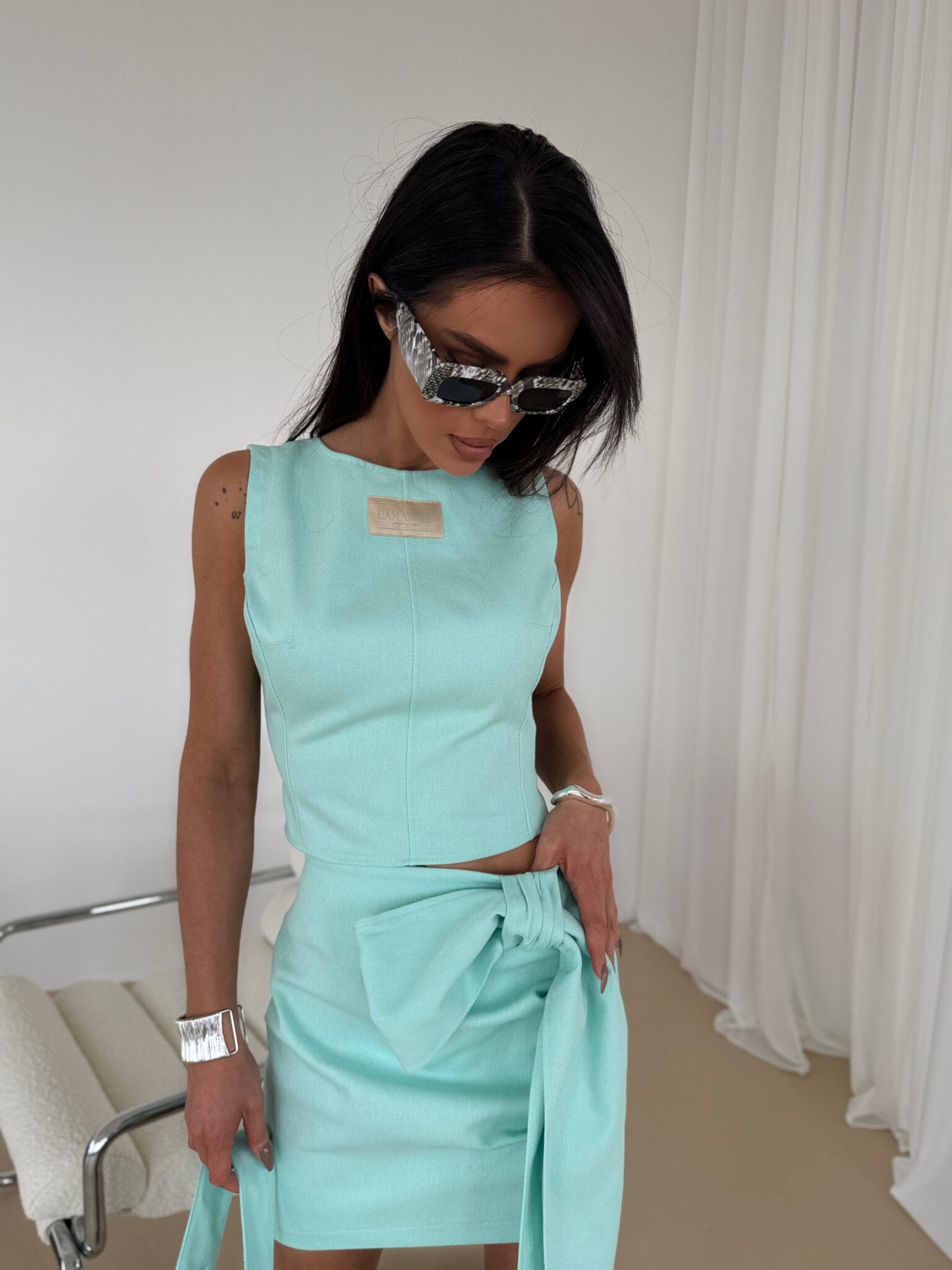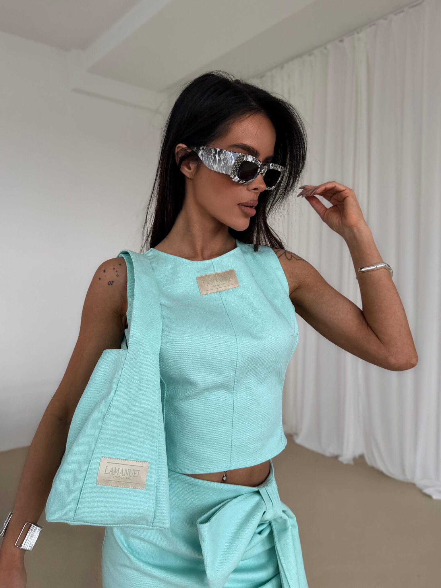 Top wykonany z denimu o wyjątkowej strukturze, z charakterystycznym wiązaniem na plecach, które nadaje mu oryginalny wygląd. Regulacja na plecach pozwala na idealne dopasowanie do sylwetki, a elastyczna wstawka zapewnia komfort noszenia. Klasyczny krój podkreśla talię i pięknie eksponuje plecy. Na przodzie naszyta subtelna metka z logo. Idealnie komponuje się z denimową spódnicą, tworząc efektowny komplet oraz torbą do kompletu.Skład: 100% bawełna