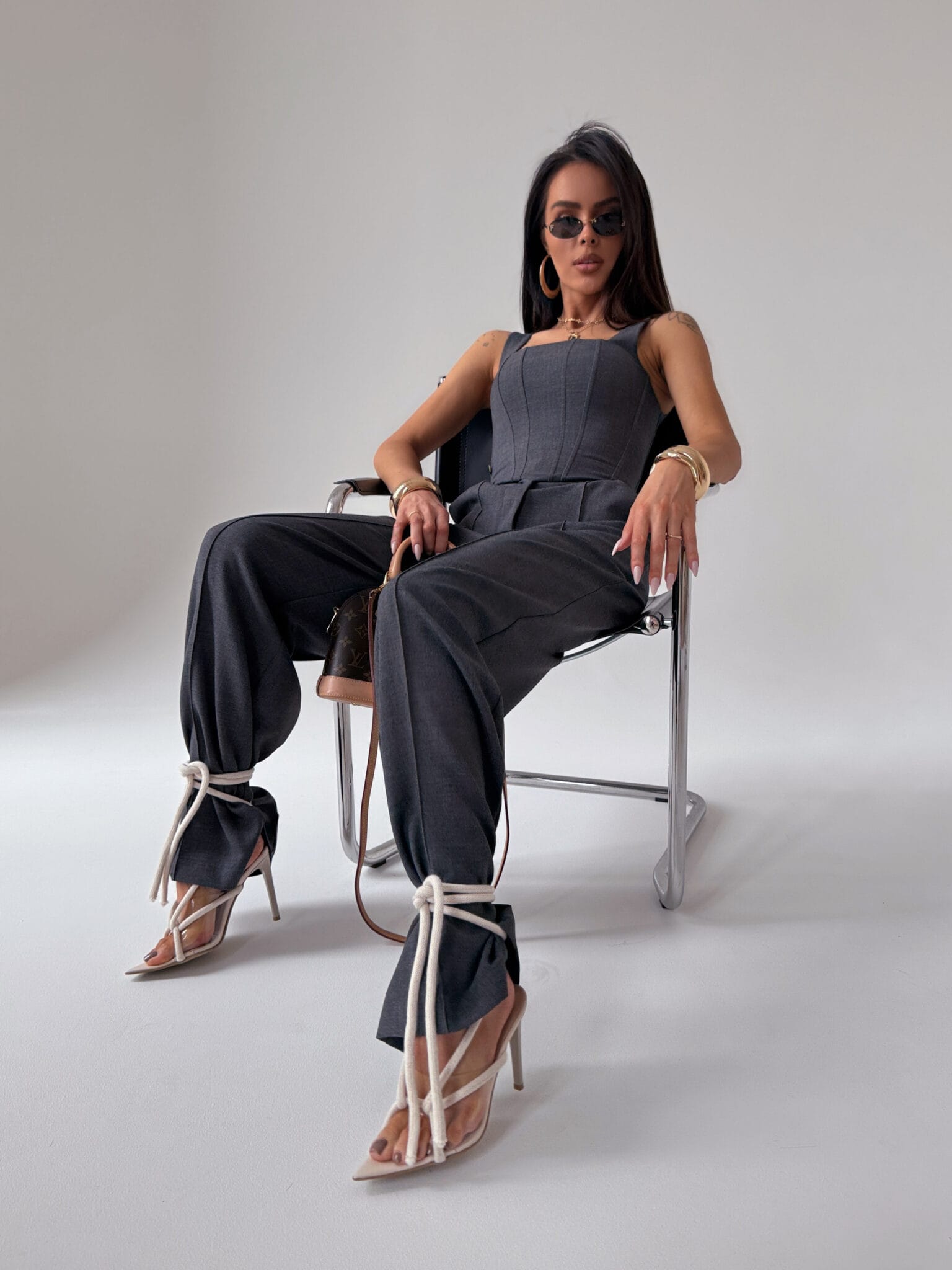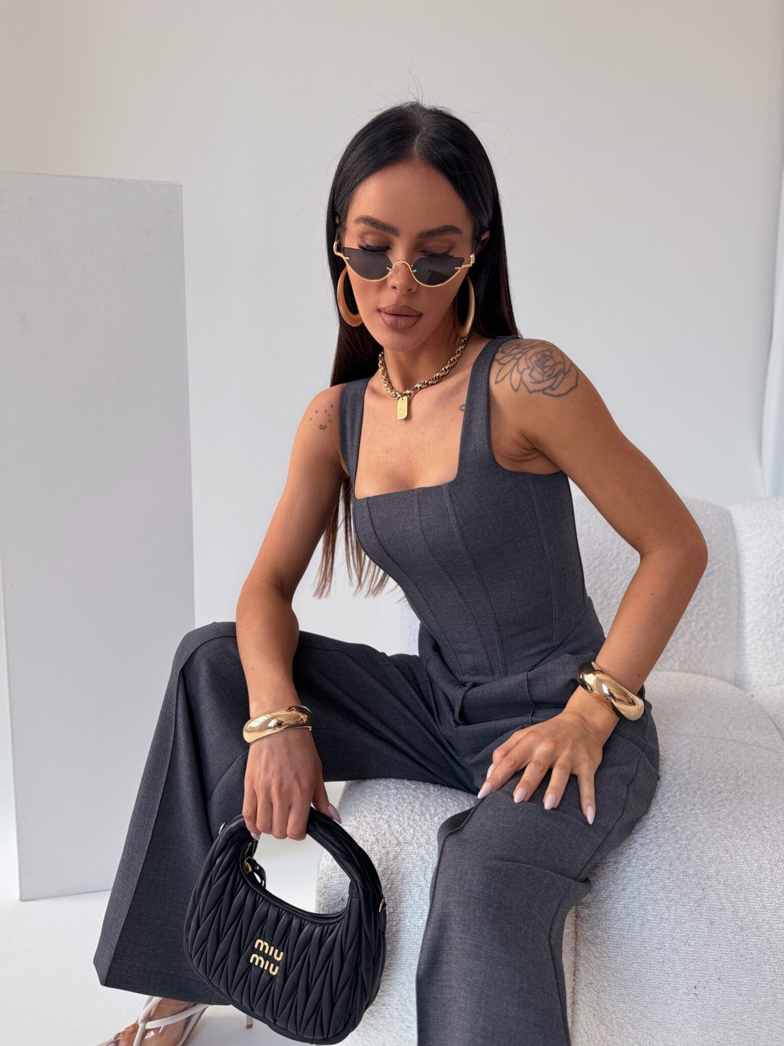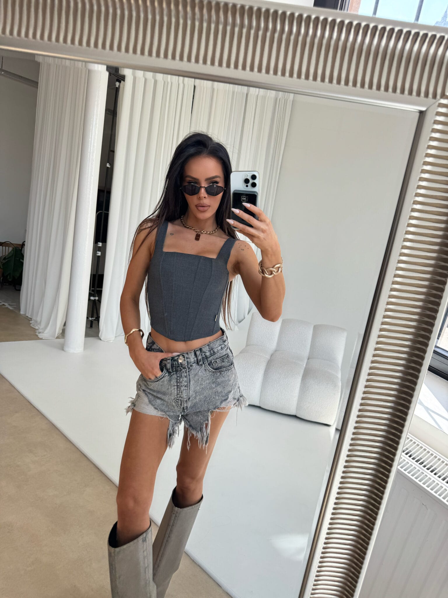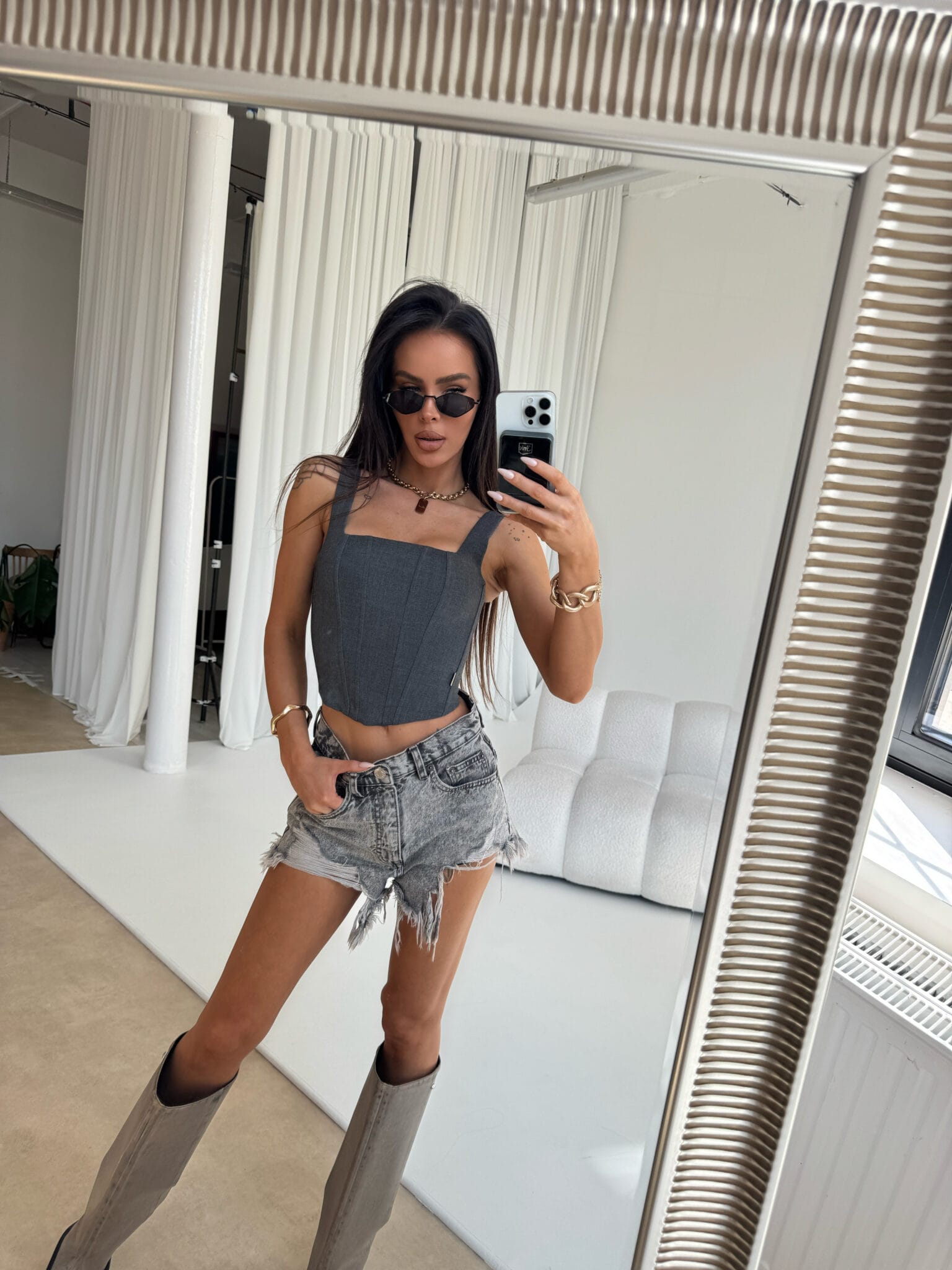 Gorset o dopasowanym kroju, wykonany z eleganckiej tkaniny z subtelną fakturą. Posiada szerokie ramiączka i geometryczny dekolt podkreślający linię ramion. Model usztywniony przeszyciami i fiszbinami, które optycznie wysmuklają sylwetkę. Zapinany na suwak z tyłu, co zapewnia wygodne dopasowanie. Doskonały zarówno do klasycznych, jak i nowoczesnych stylizacji, świetnie komponuje się z szerokimi spodniami i dopasowanymi spódnicami oraz spodenkami.Skład: 68% poliester 29% rayon 3% spandex