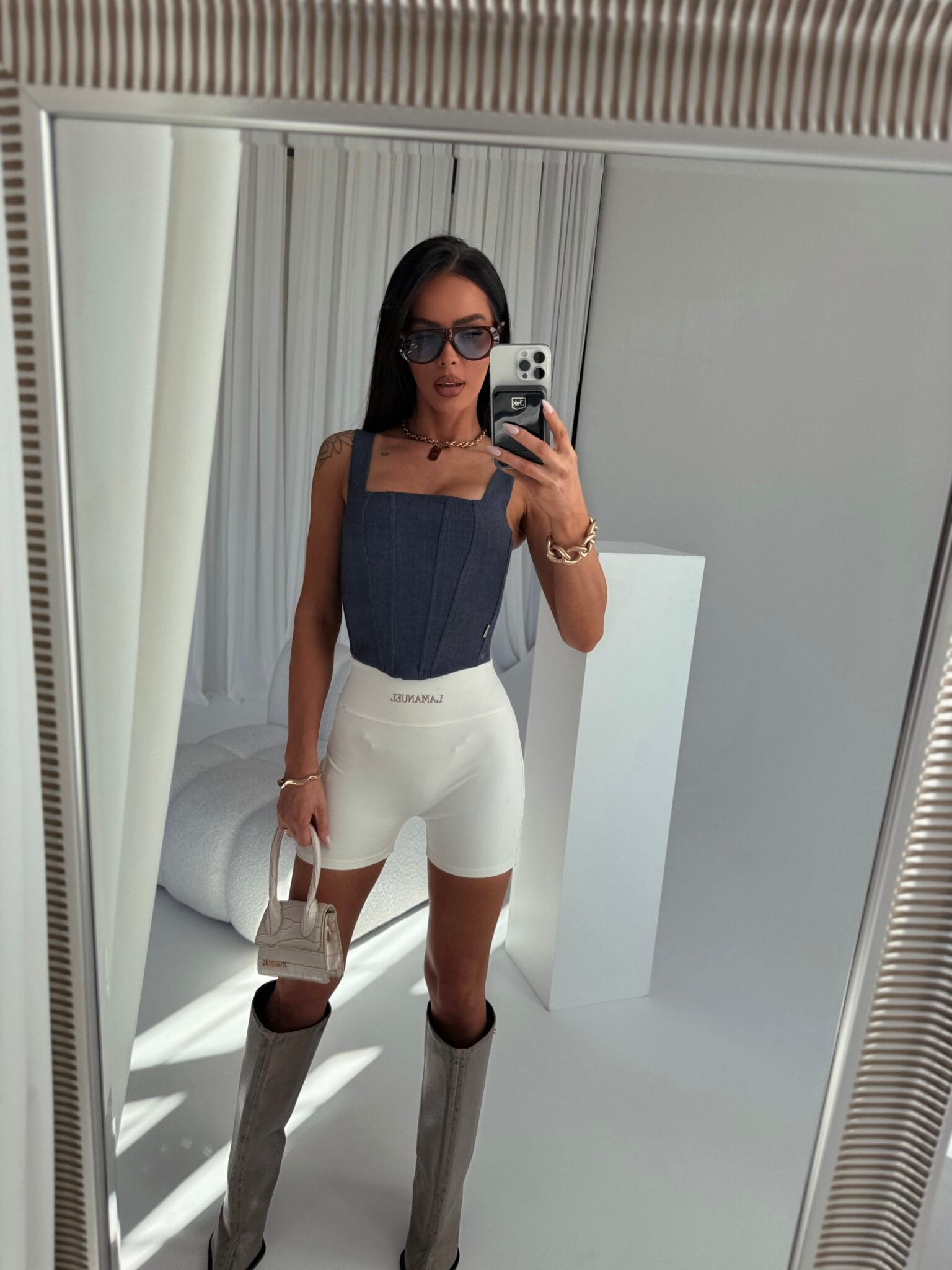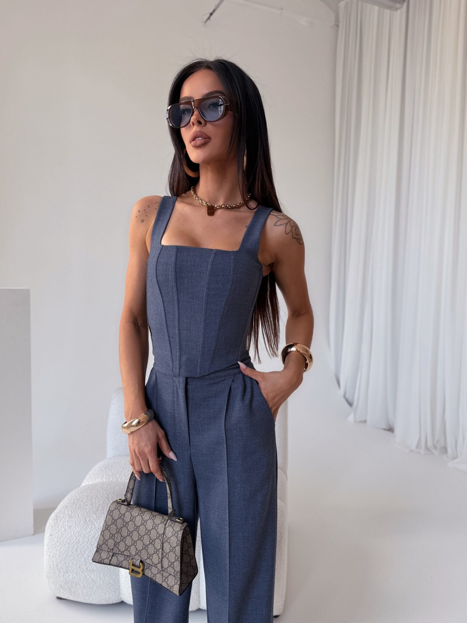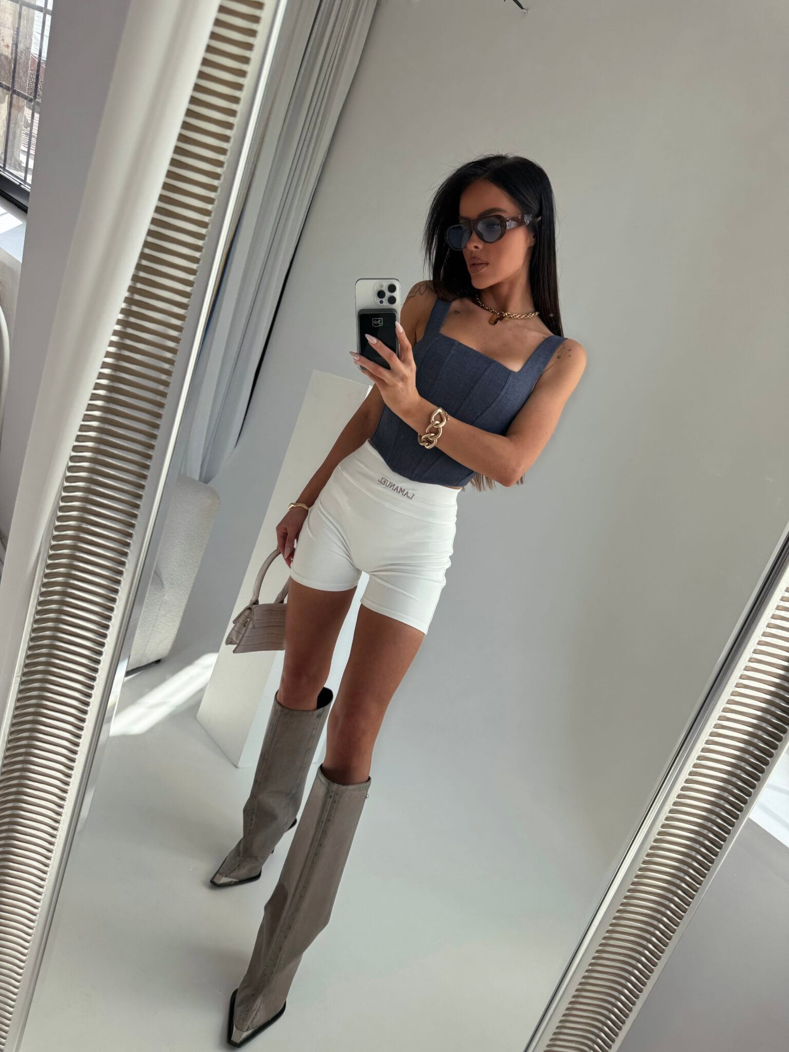 Gorset o dopasowanym kroju, wykonany z eleganckiej tkaniny z subtelną fakturą. Posiada szerokie ramiączka i geometryczny dekolt podkreślający linię ramion. Model usztywniony przeszyciami i fiszbinami, które optycznie wysmuklają sylwetkę. Zapinany na suwak z tyłu, co zapewnia wygodne dopasowanie. Doskonały zarówno do klasycznych, jak i nowoczesnych stylizacji, świetnie komponuje się z szerokimi spodniami i dopasowanymi spódnicami oraz spodenkami.Skład: 68% poliester 29% rayon 3% spandex