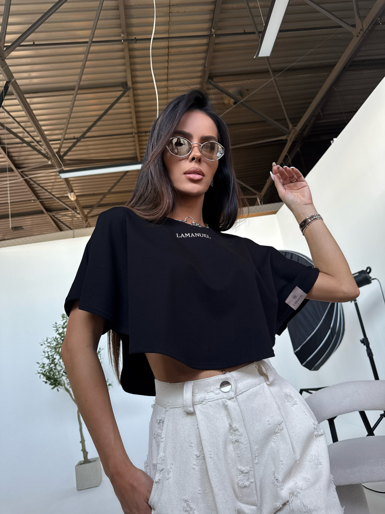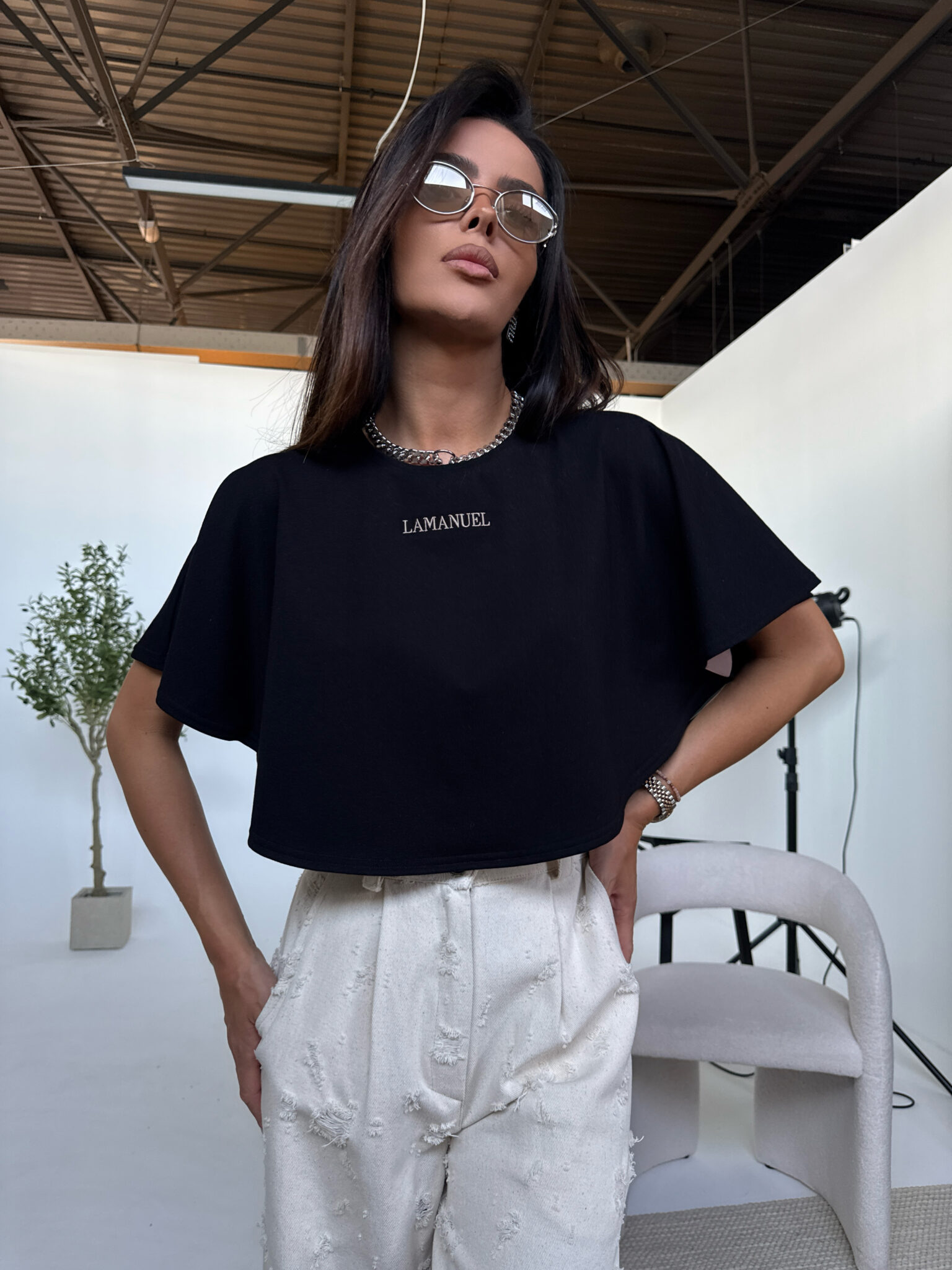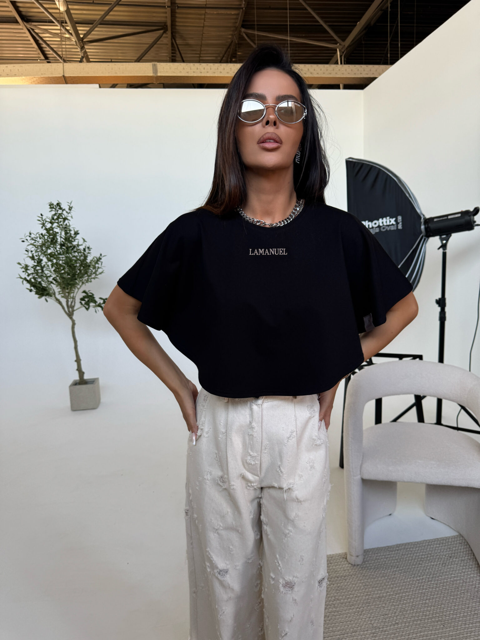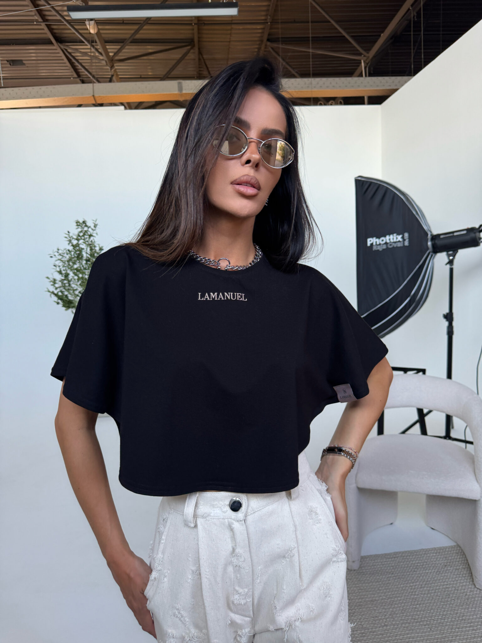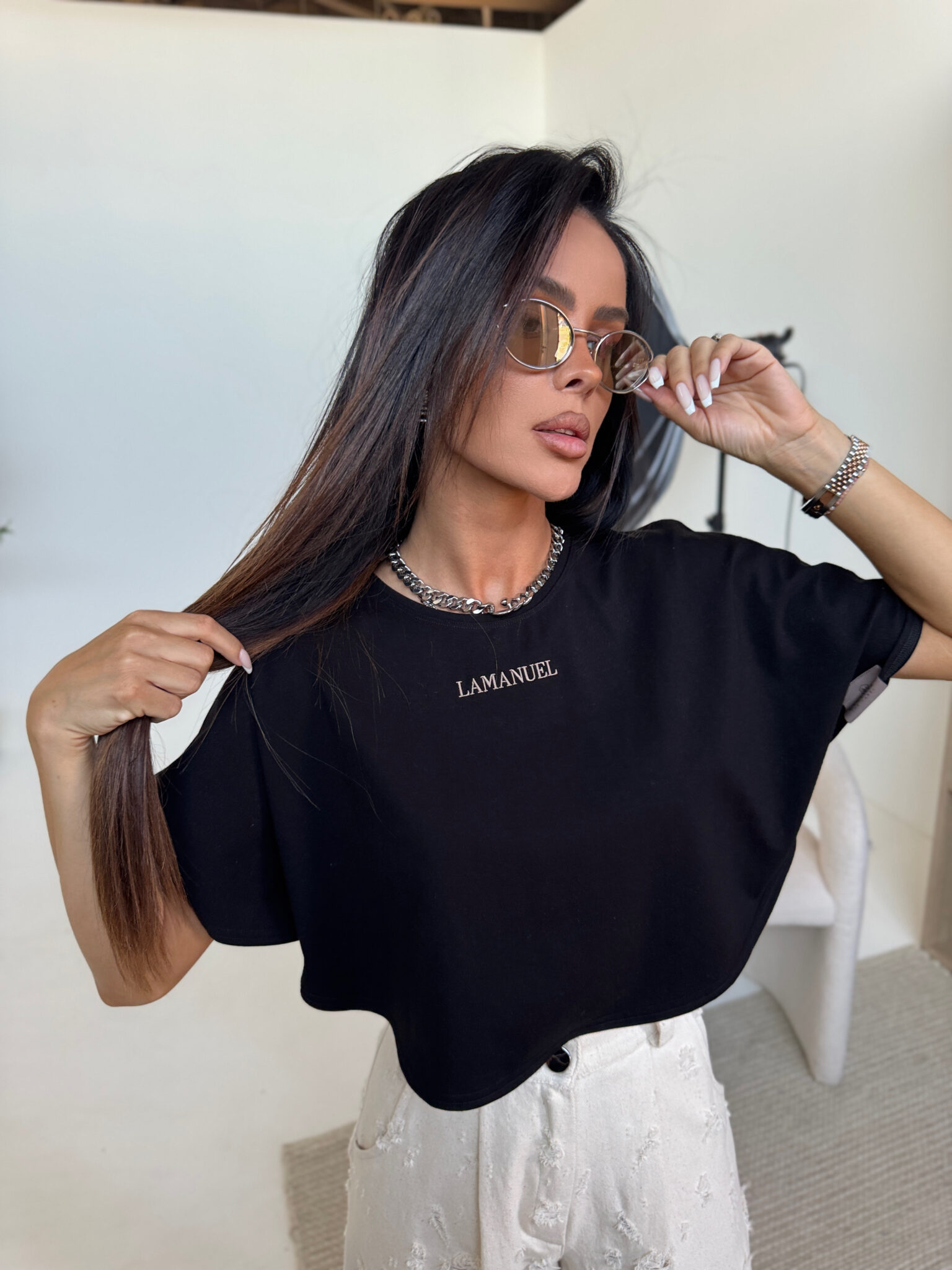 T-shirt o nietuzinkowym, półokrągłym kroju, który pięknie układa się na sylwetce i nadaje stylizacji lekkości. Dolna linia cięcia została wykończona w kształcie koła, a materiał został precyzyjnie złapany w dwóch miejscach maszynowo, co tworzy subtelny, architektoniczny detal. Luźny, krótki fason z szerokim rękawem sprawia, że to idealna propozycja na codzienne, letnie dni. Z przodu haftowane logo LAMANUEL, a na boku naszywka z sygnaturą marki – detale, które podkreślają estetykę premium.