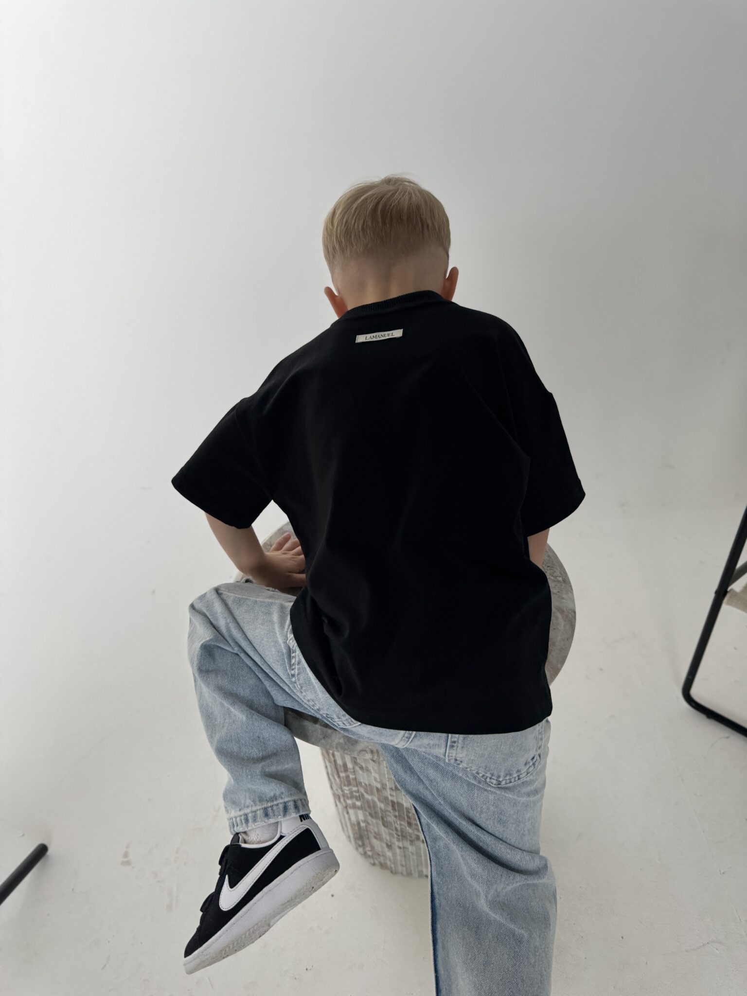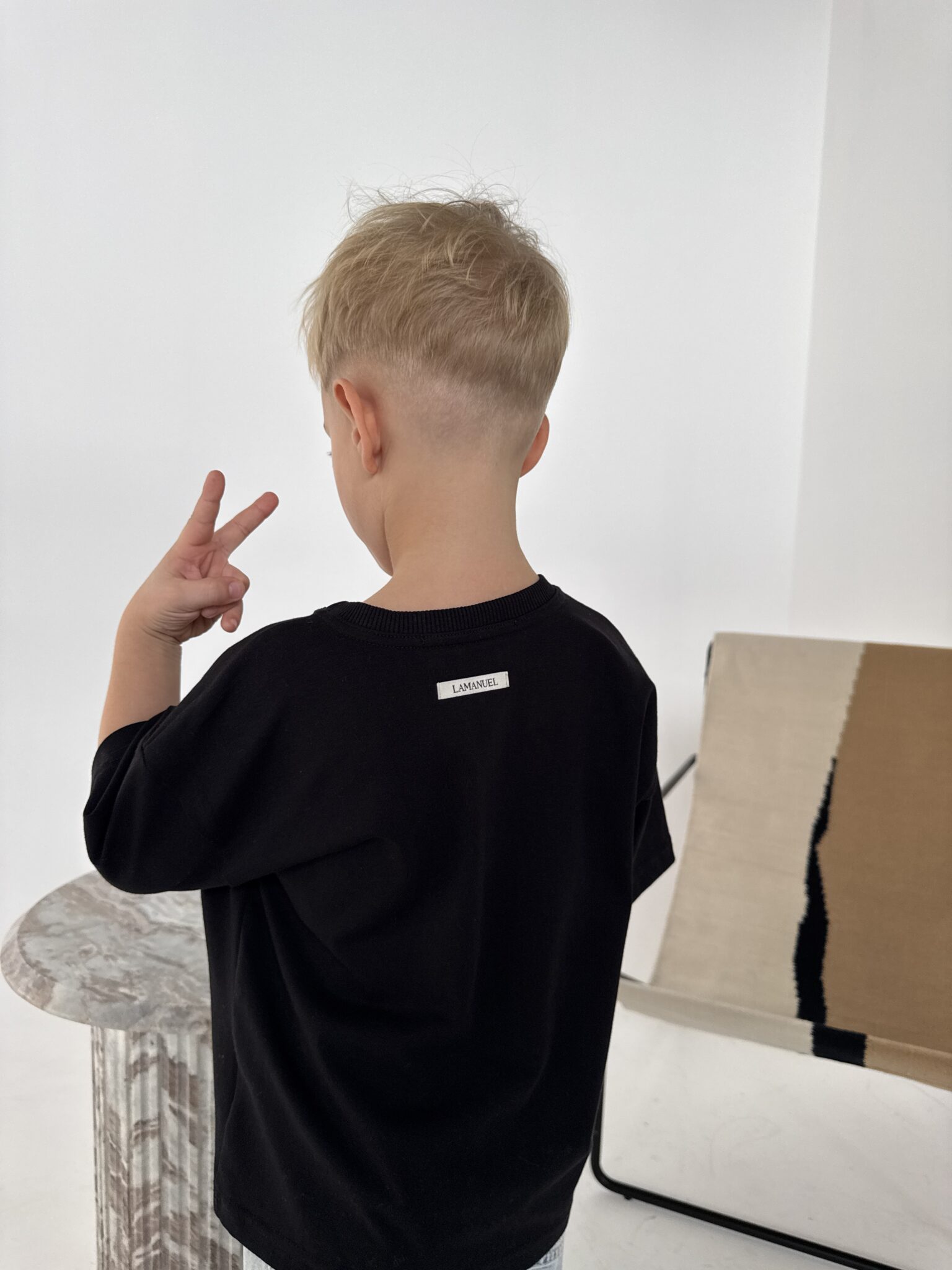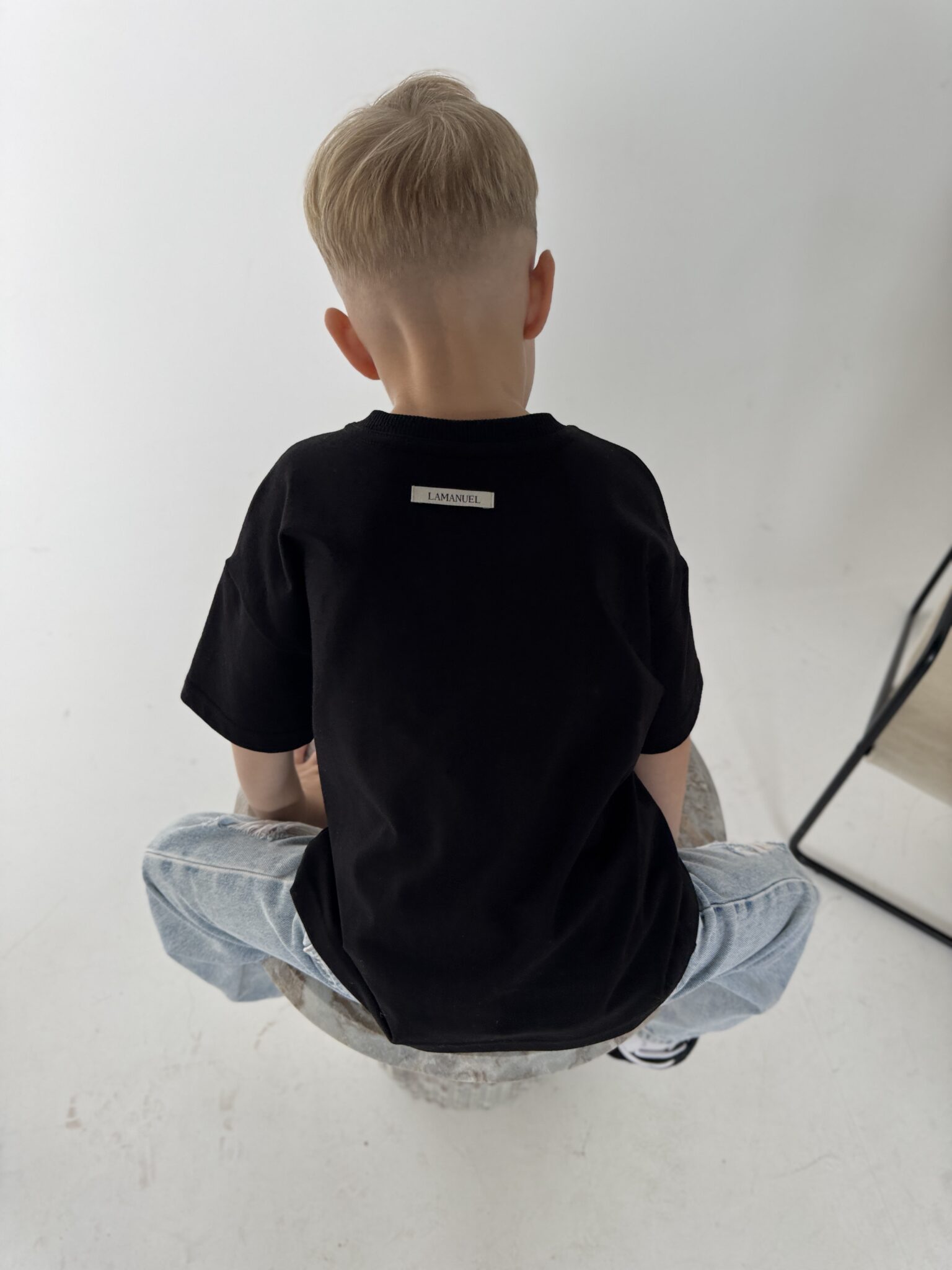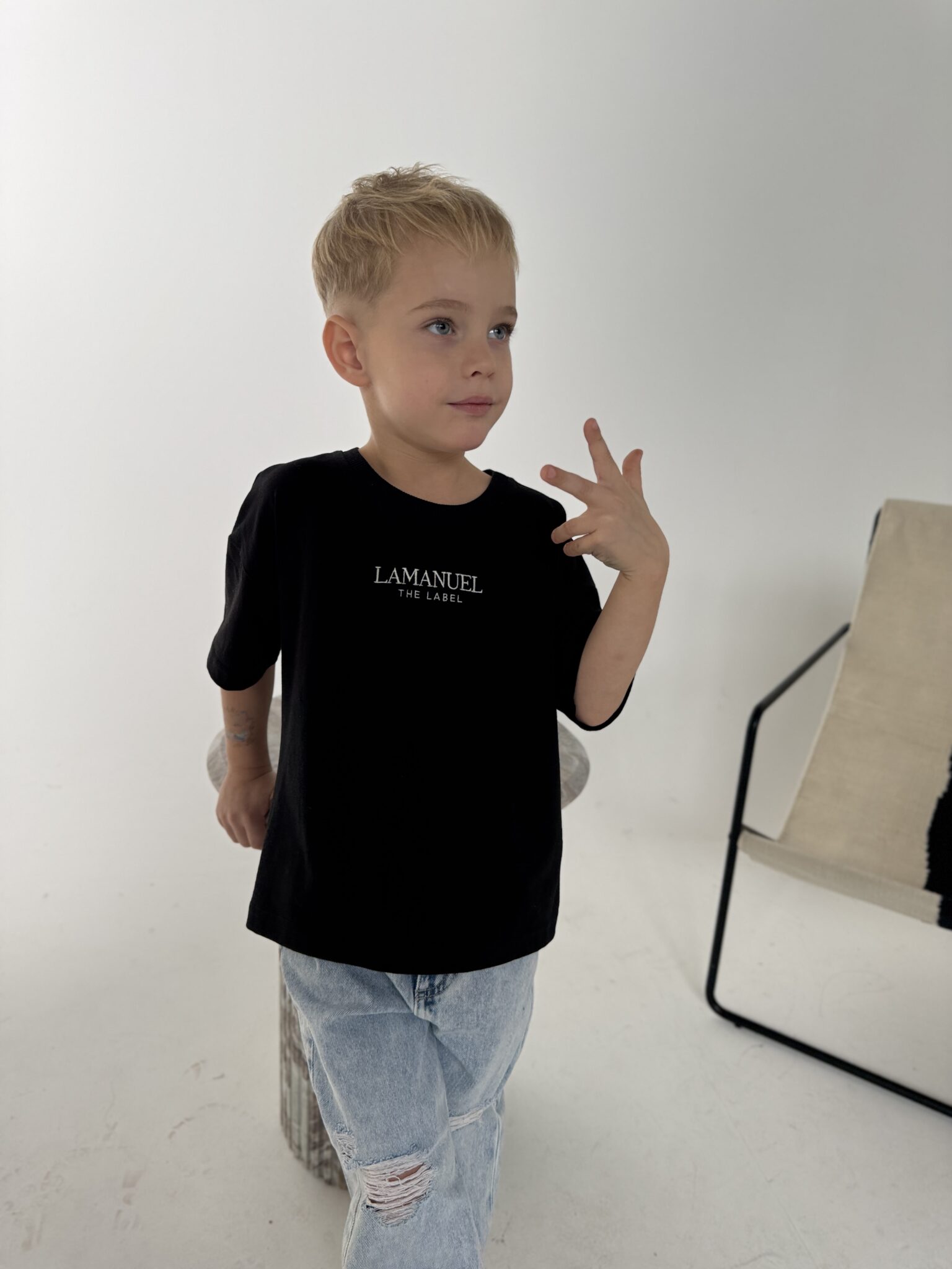 Uroczy t-shirt w stylu oversize, uszyty z przyjemnej w dotyku bawełny. Z przodu haft z logo LAMANUEL – mini wersja dorosłego modelu. Komfortowy i trwały, idealny do zestawu rodzinnego matchy.Skład: 100% bawełna